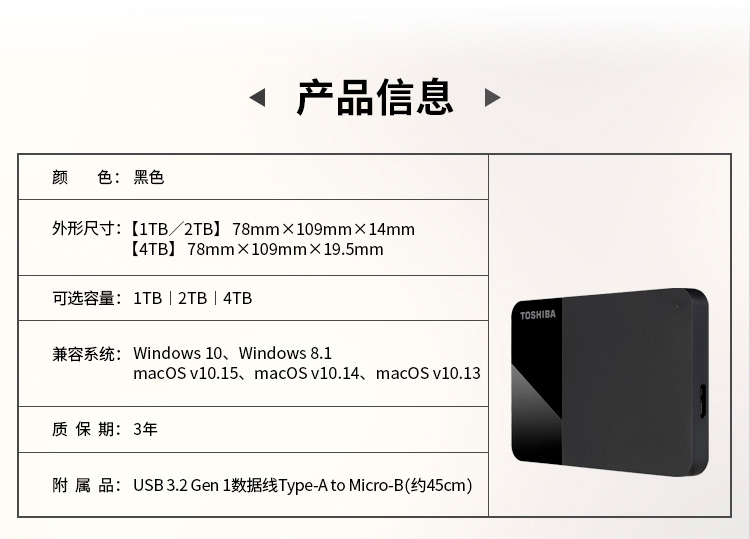 商品名称:东芝 移动硬盘 基础商务款 1TB READY B3系列 USB3.0 商务黑 兼容Mac 高速传输(单位:个)