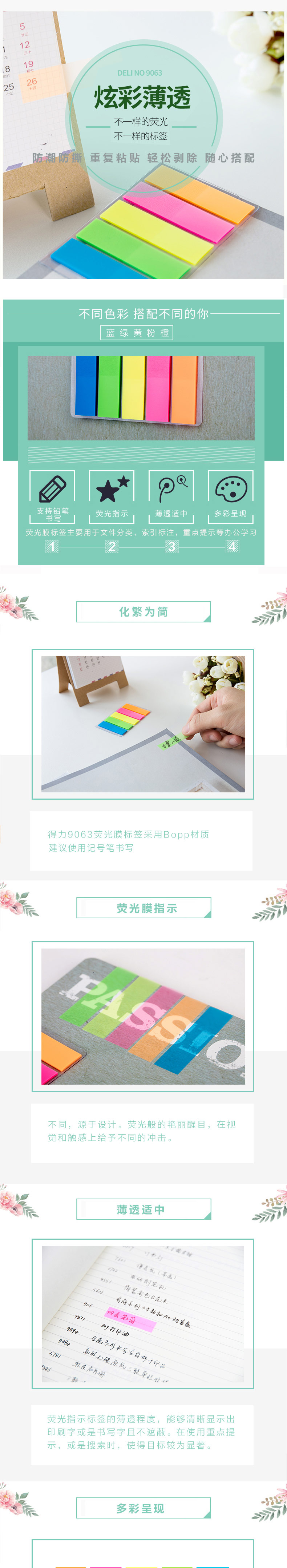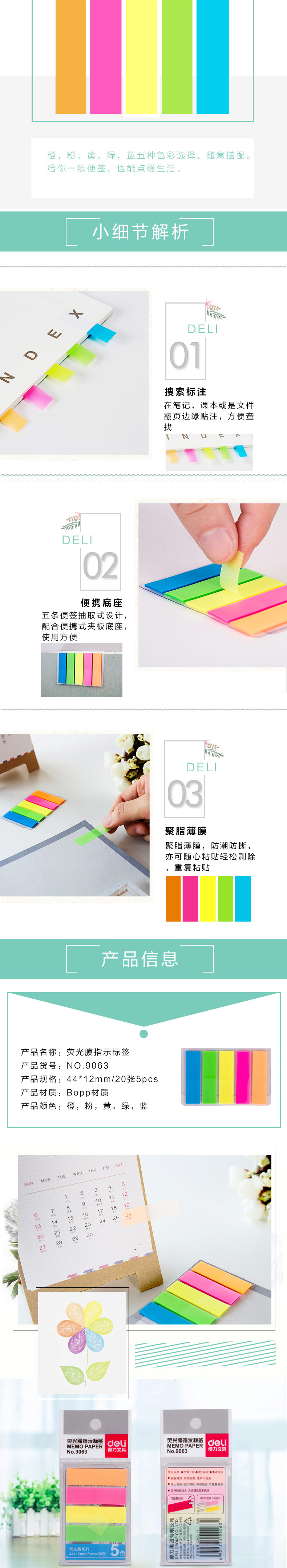 商品名称:得力9063指示标签12*44mm 5色*20张(单位:卡)