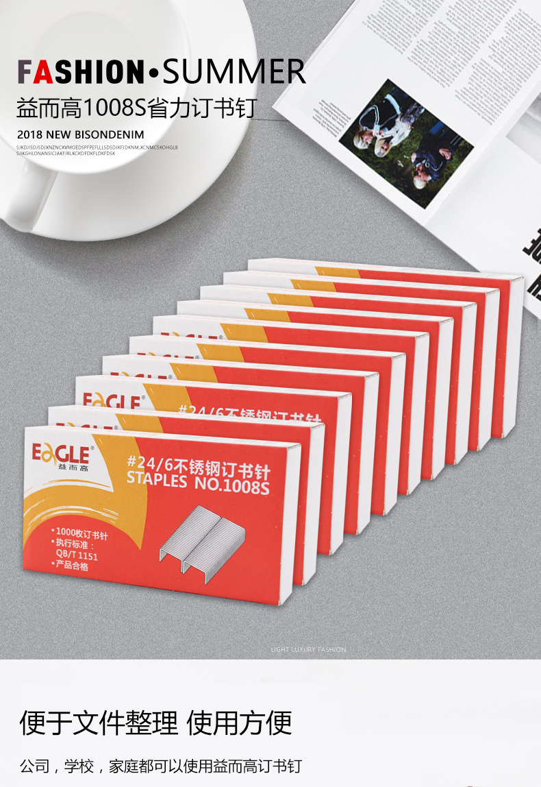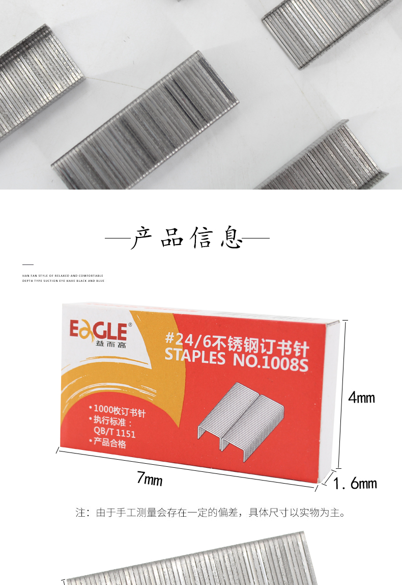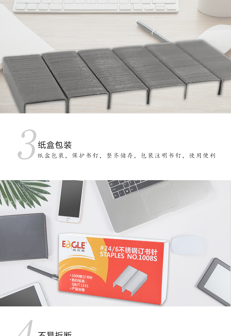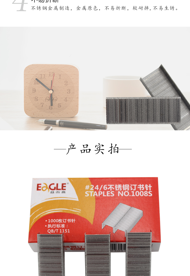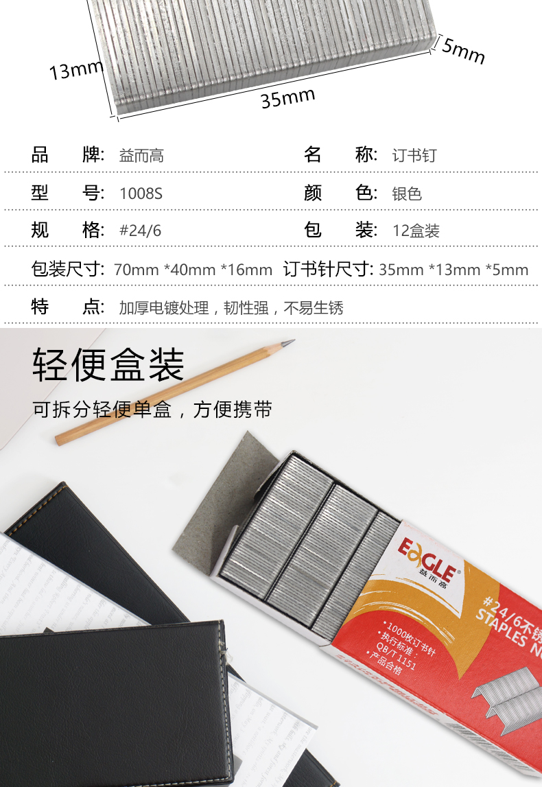 商品名称:益而高1008S不锈钢统一书钉订书针 1000枚/盒(单位:盒)
