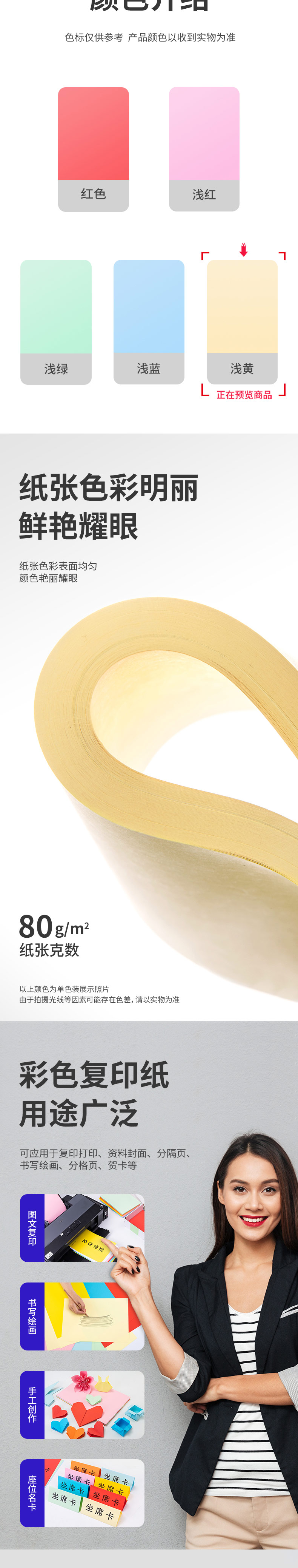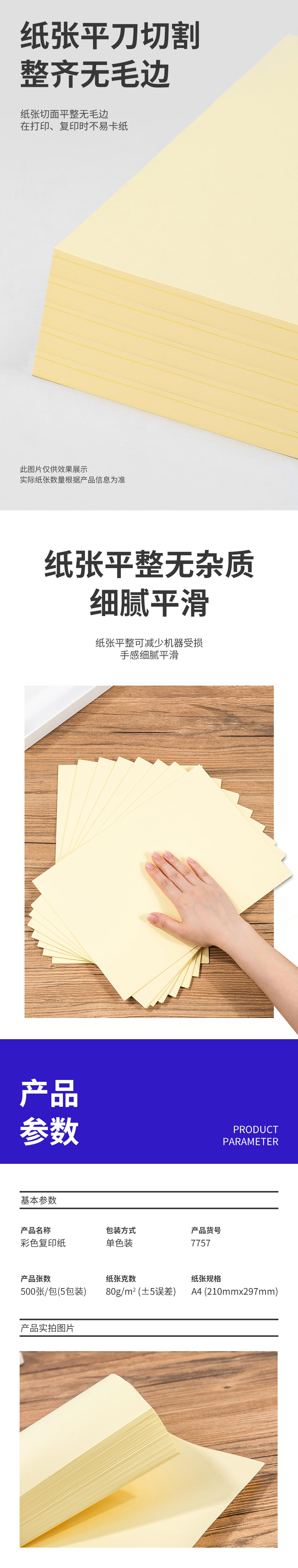 商品名称:得力7757彩色复印纸 A4 80g 500张/包 5包/箱 浅黄(单位:包)