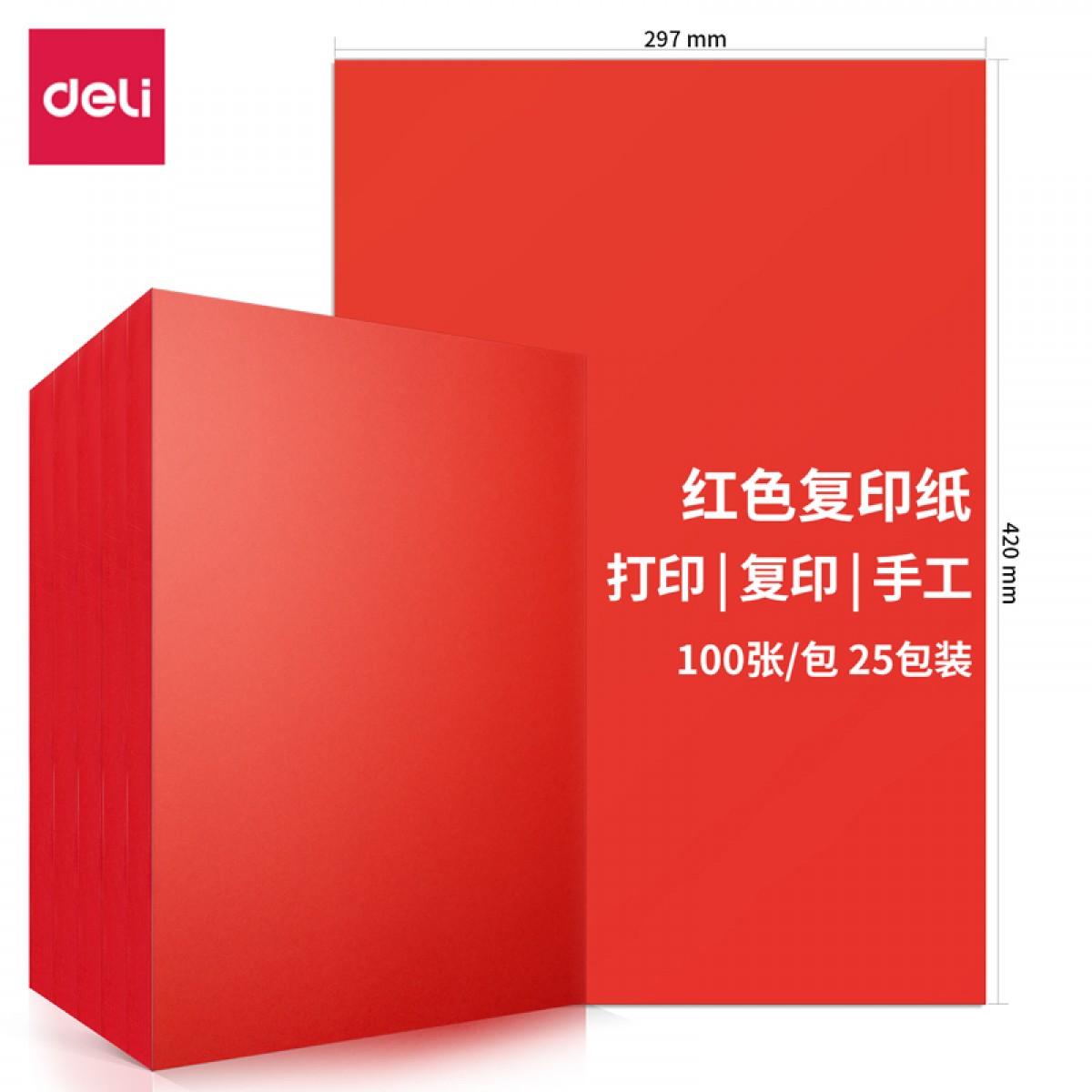 得力7758彩色复印纸 A3 80g 100张/包 25包/箱 红色(单位:包)
