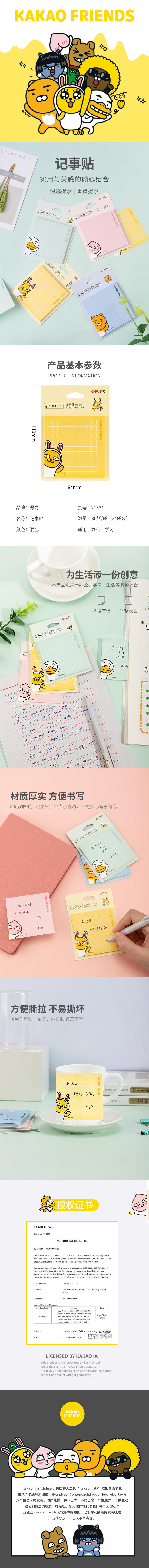 商品名称:得力21531kakaofriends记事贴 76*76mm 30张 颜色随机(单位:包)