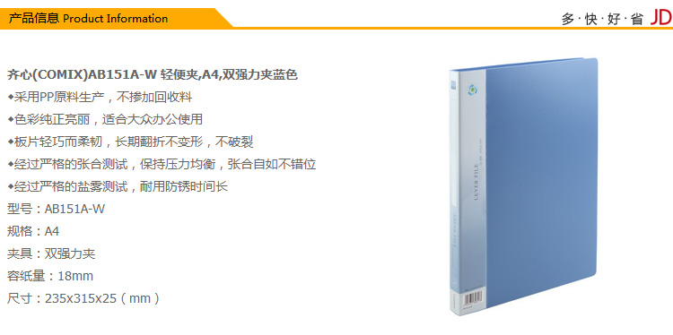 商品名称:齐心AB151A-W 加厚型文件夹双强力夹A4 蓝色