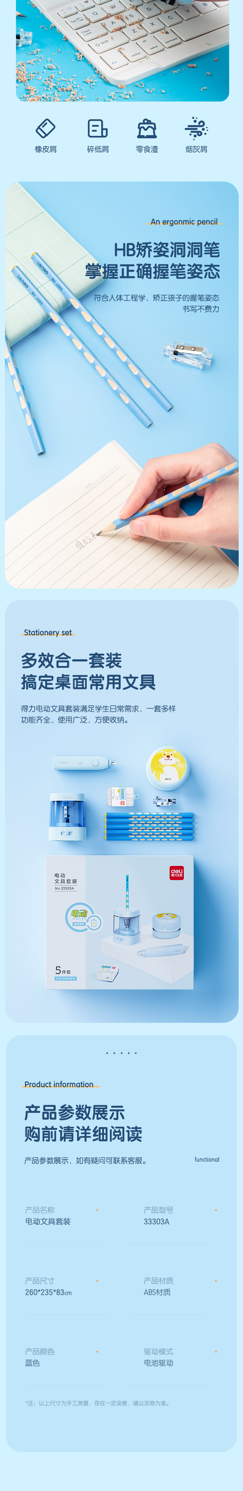 商品名称:得力68916电动文具套装 蓝色 (线下型号:33303A)(单位:套)