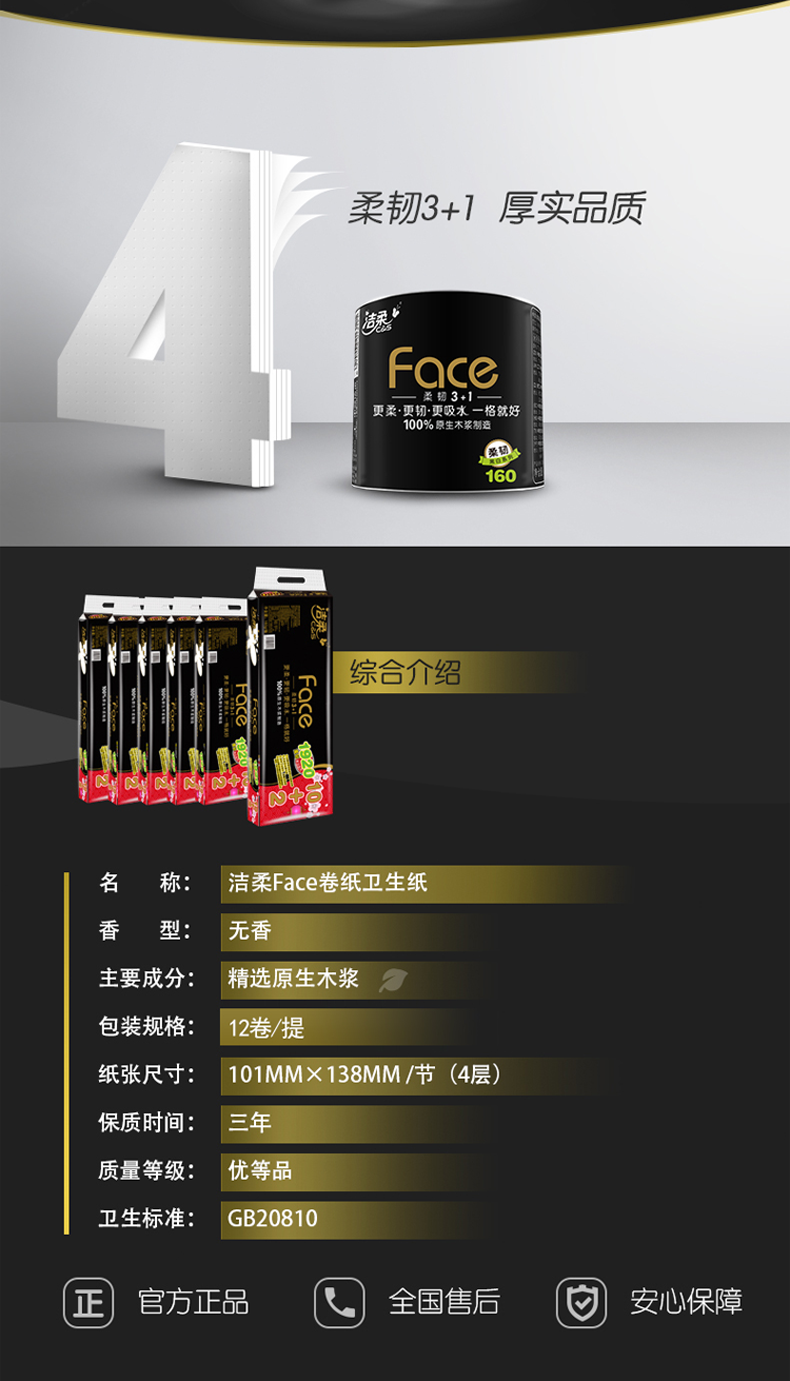商品名称:洁柔BJ178-12卷纸Face有芯卫生纸 4层 160g*12卷/提(单位:提)
