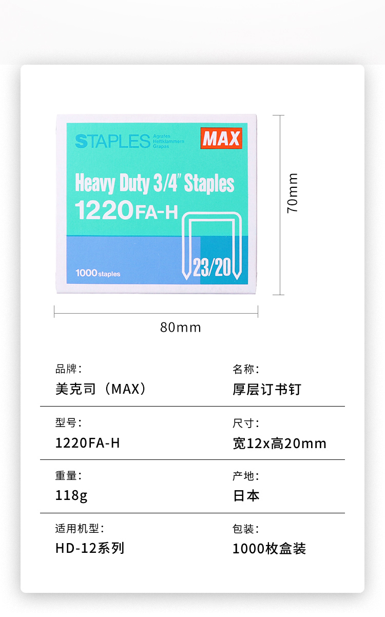 商品名称:日本美克斯1220FA-H进口订书针MAX(单位:盒)
