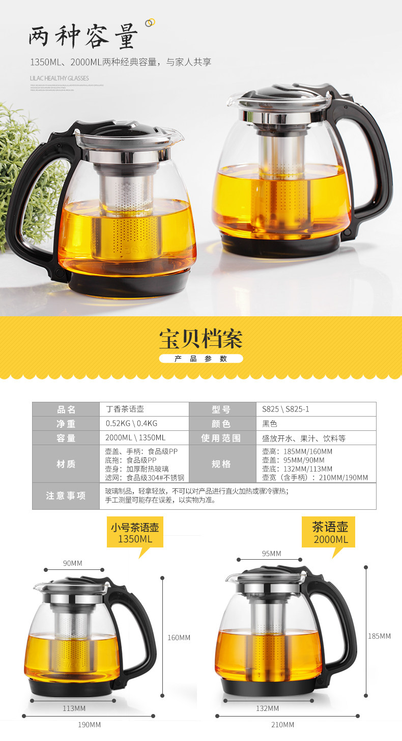 商品名称:紫丁香S825-1耐热玻璃过滤茶壶 清心杯套装 1350ml(单位:个)