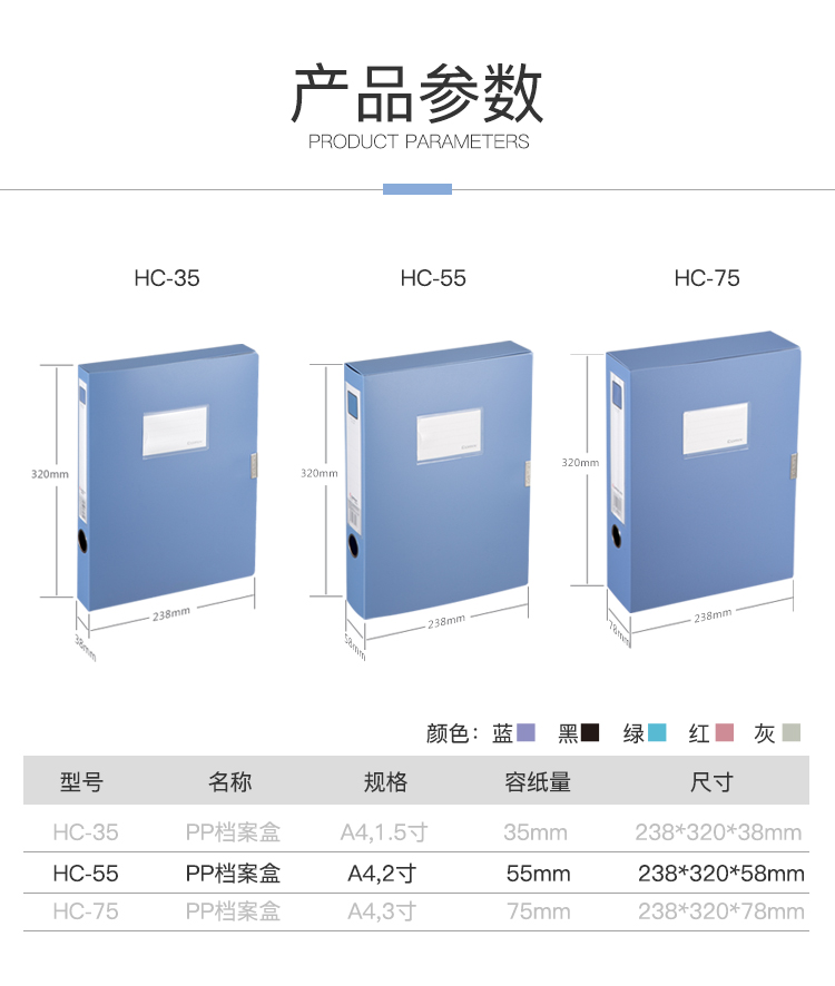 商品名称:齐心HC-55档案盒A4 55mm 灰色(单位:个)