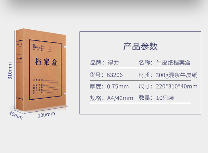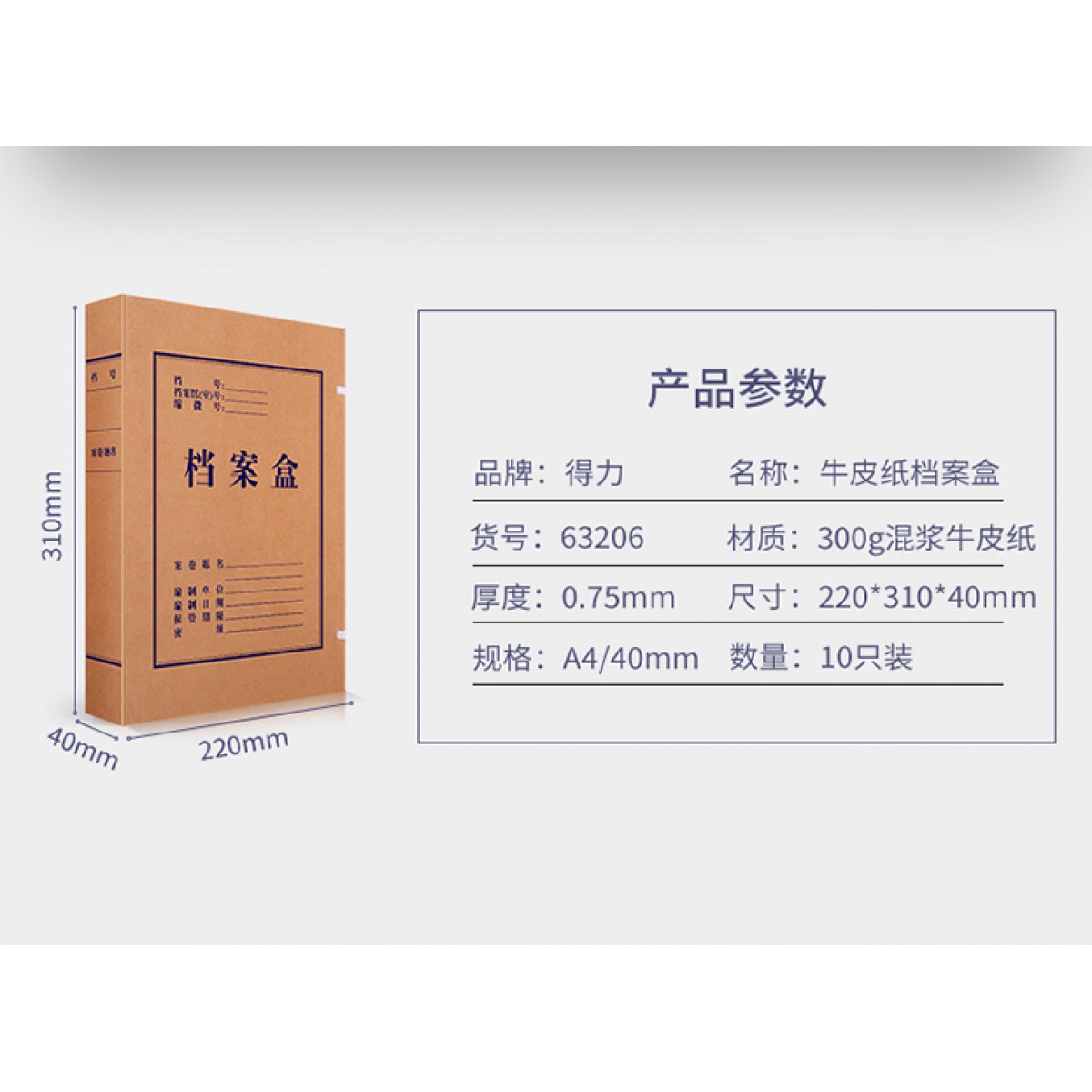 商品名称:得力63206 牛皮纸档案盒220x310 40mm 10只/包(单位:包)
