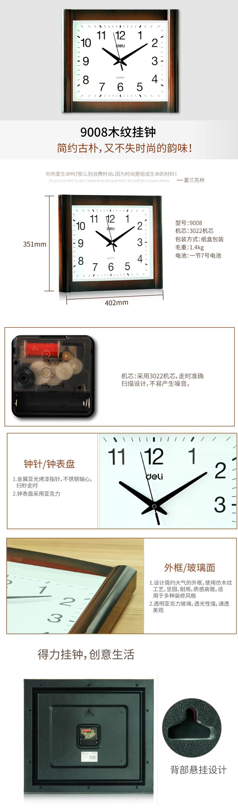 得力9008挂钟 土棕色 40*35cm 单位:个