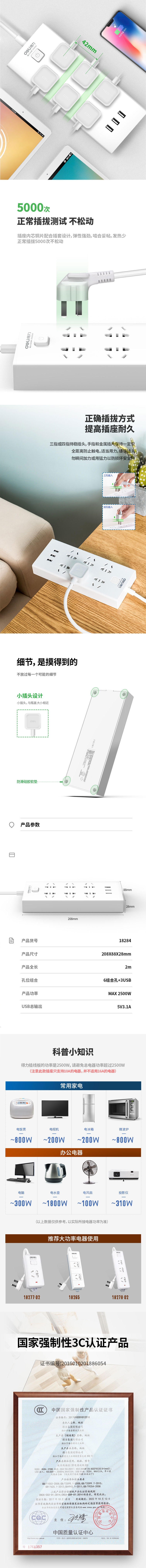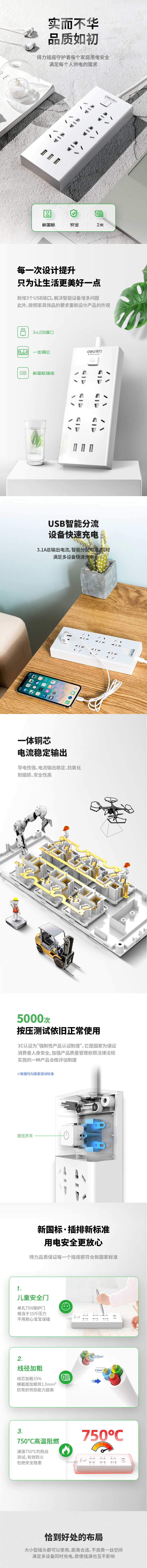 商品名称:得力18284插座 6组+3U 总长2米 彩盒装 白色 单位:个