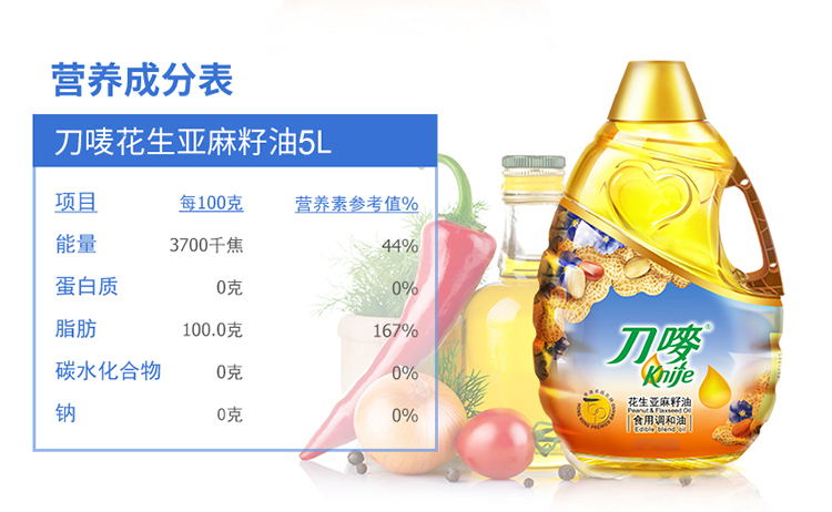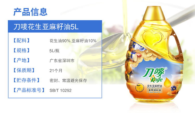 商品名称:刀唛花生亚麻籽油 5L 单位:桶