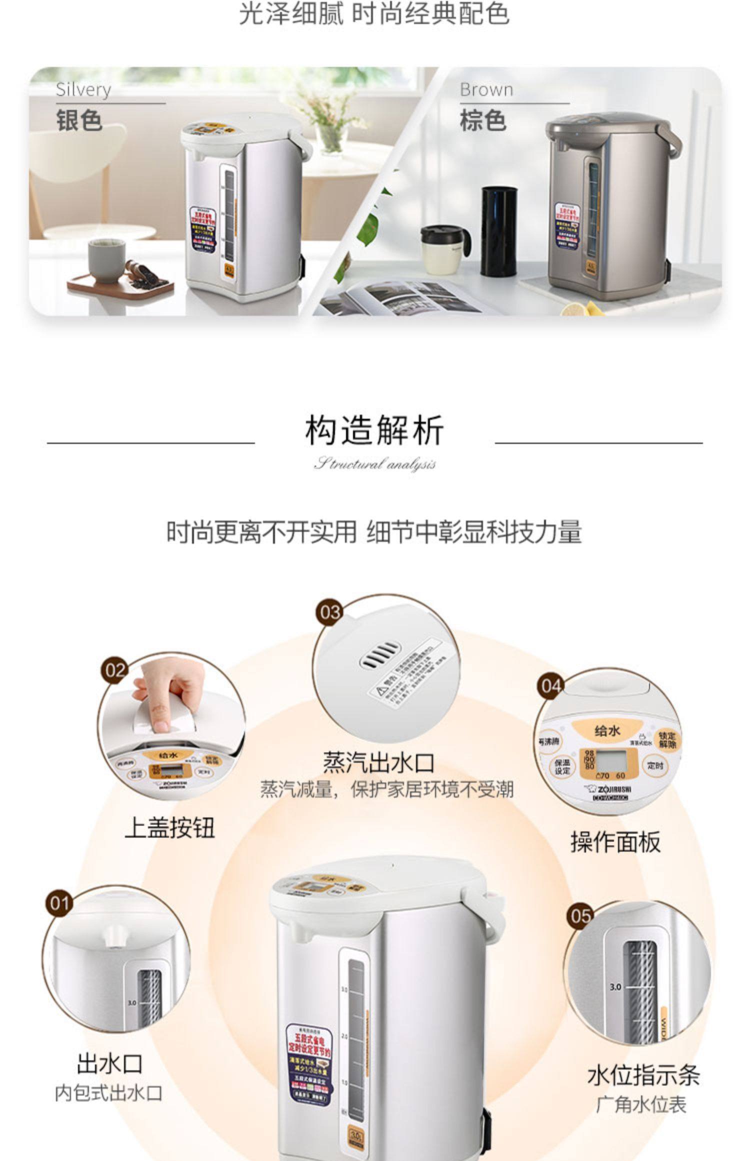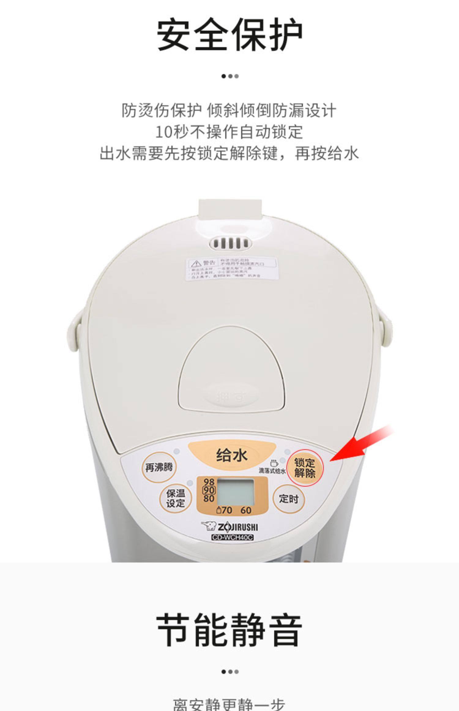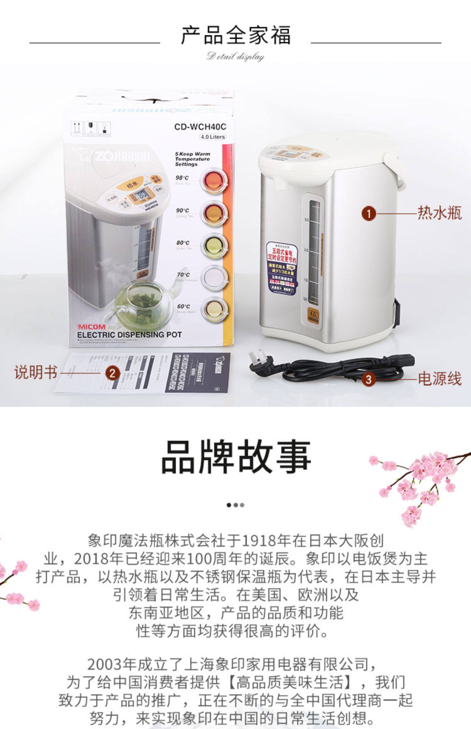 商品名称:象印CD-WCH40C电热水壶 微电脑五段控温 银色 4L 单位:个