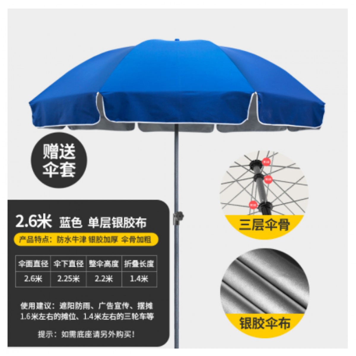 大号太阳伞大雨伞 2.6m蓝色+银胶