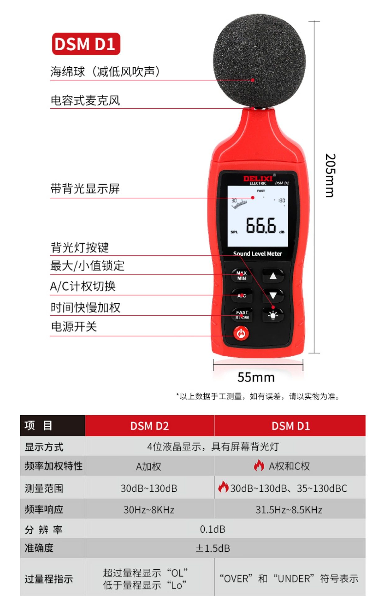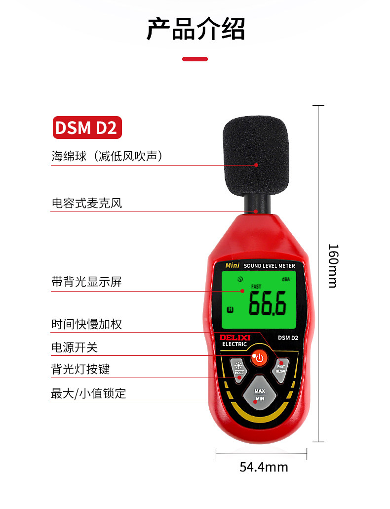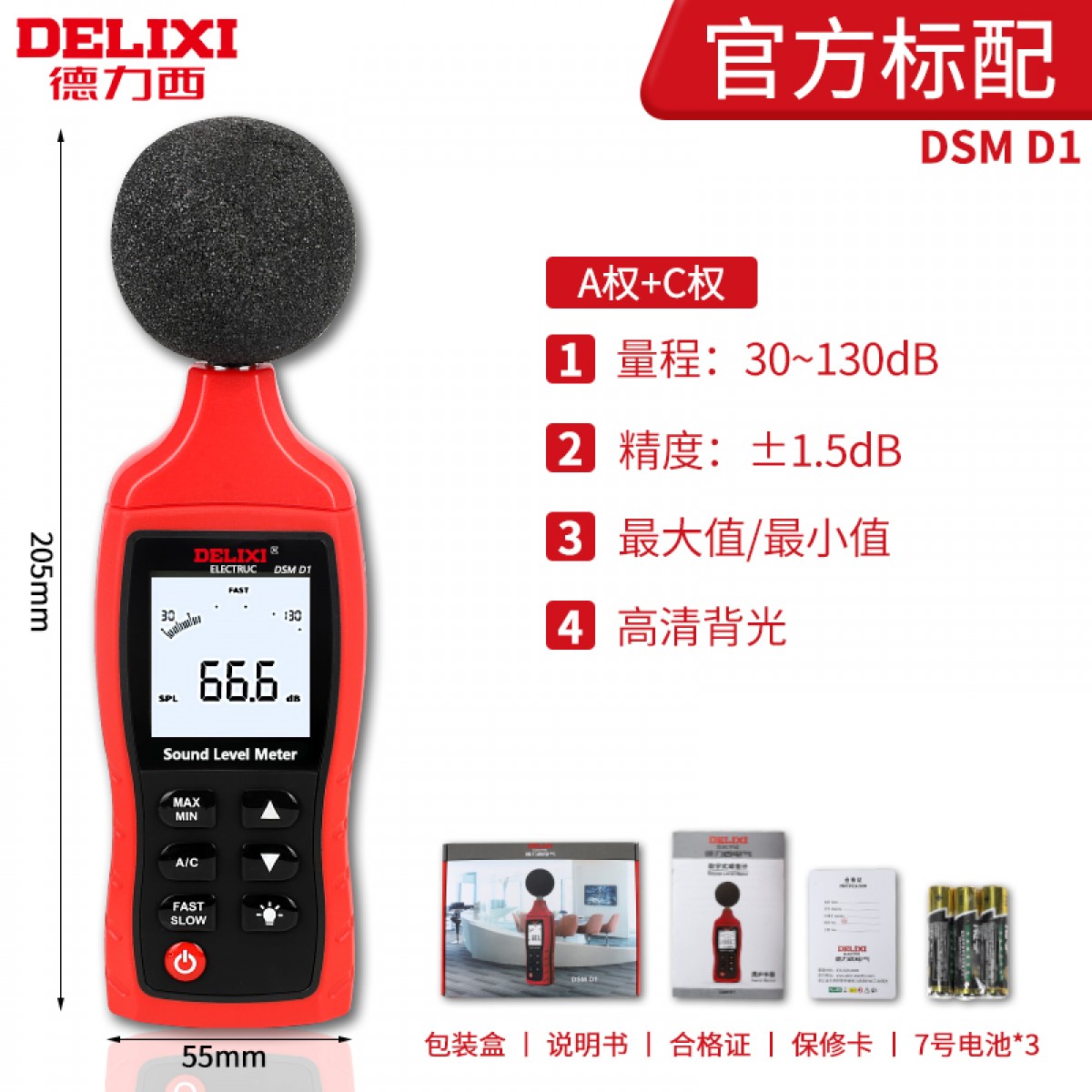 商品名称:德力西DSM D1电气数字式噪音计分贝仪 30-130dB A/C模式可选 单位:台