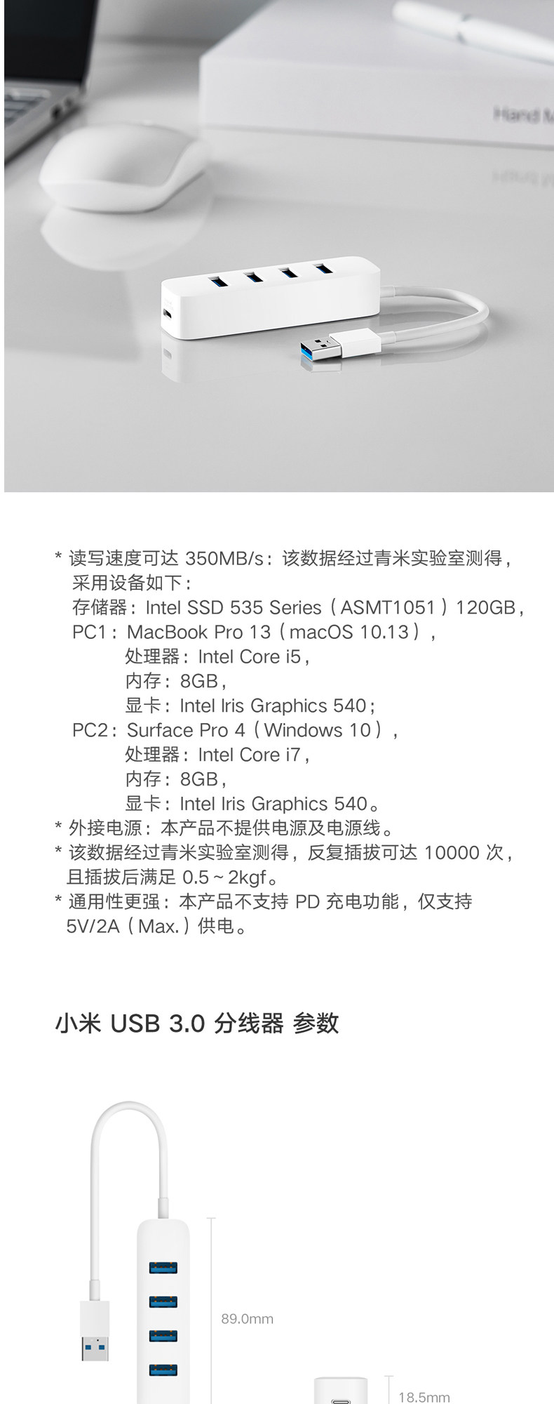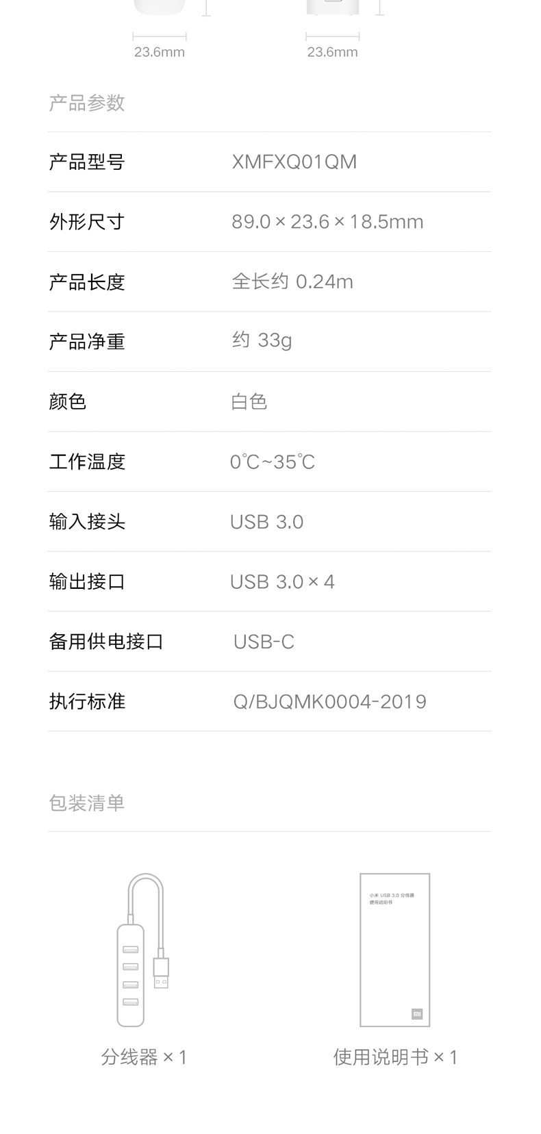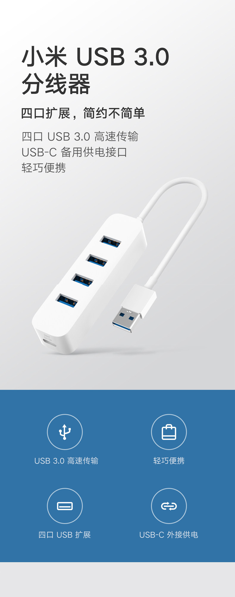 商品名称:小米分线器USB3.0一拖四外接usb插口 白色 单位:个