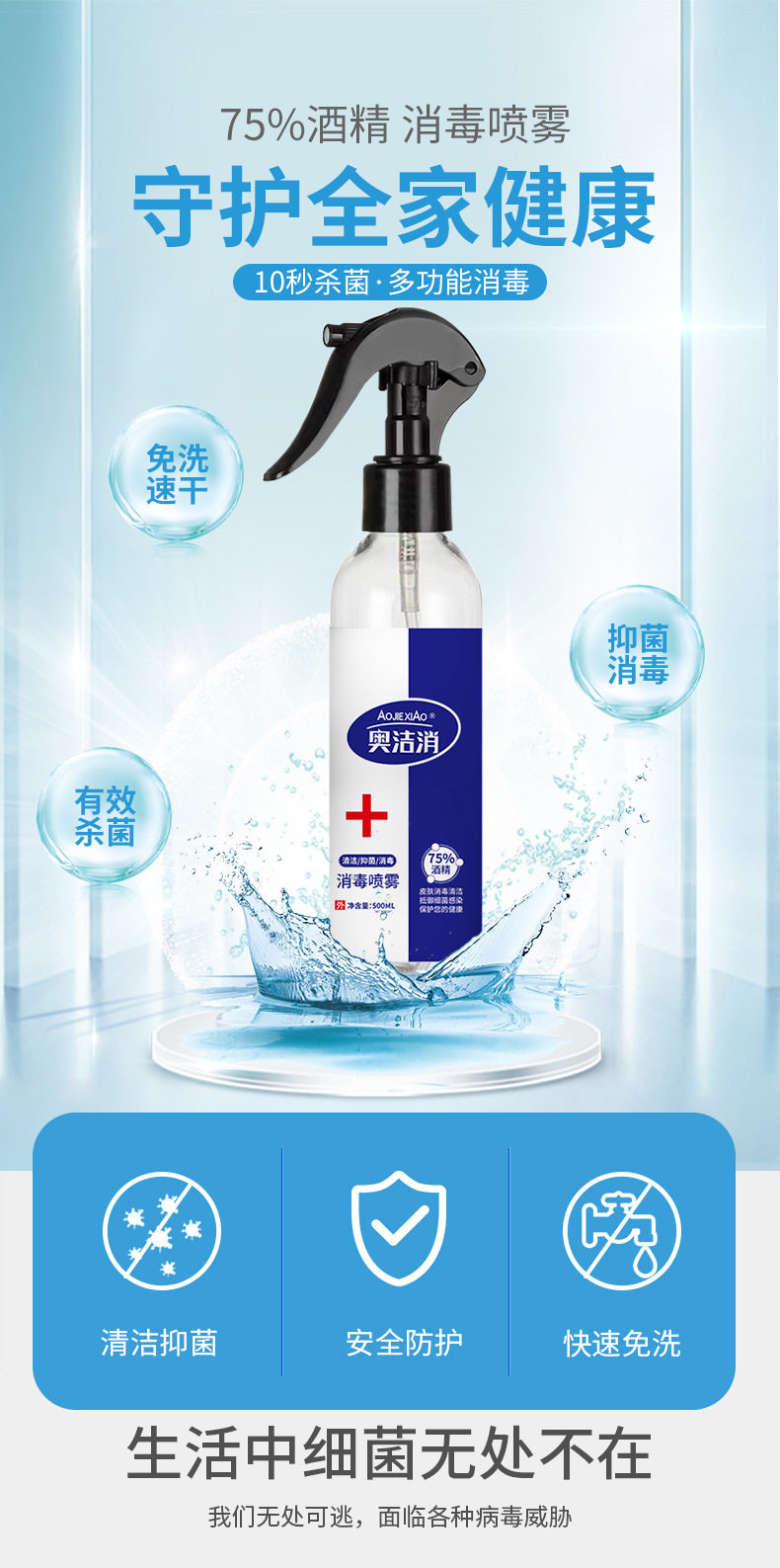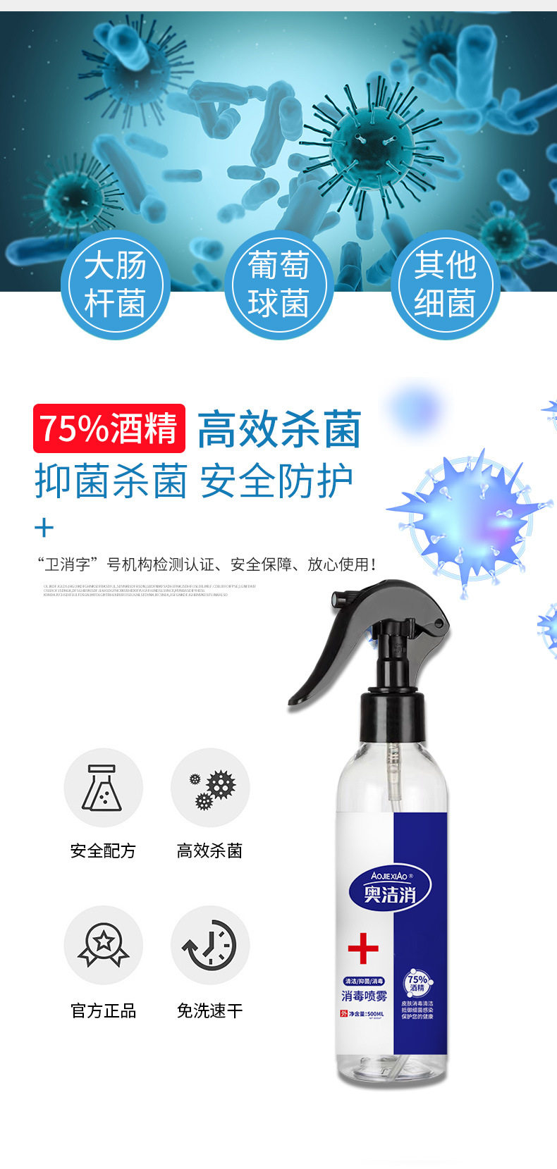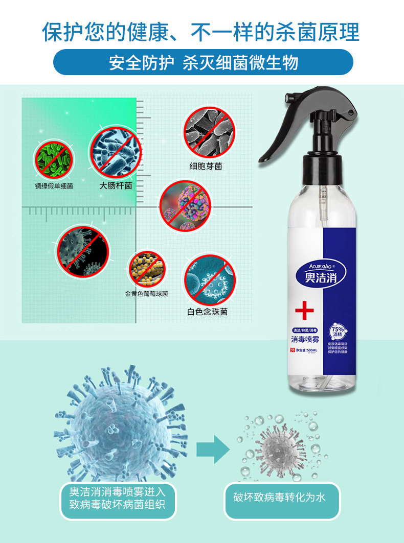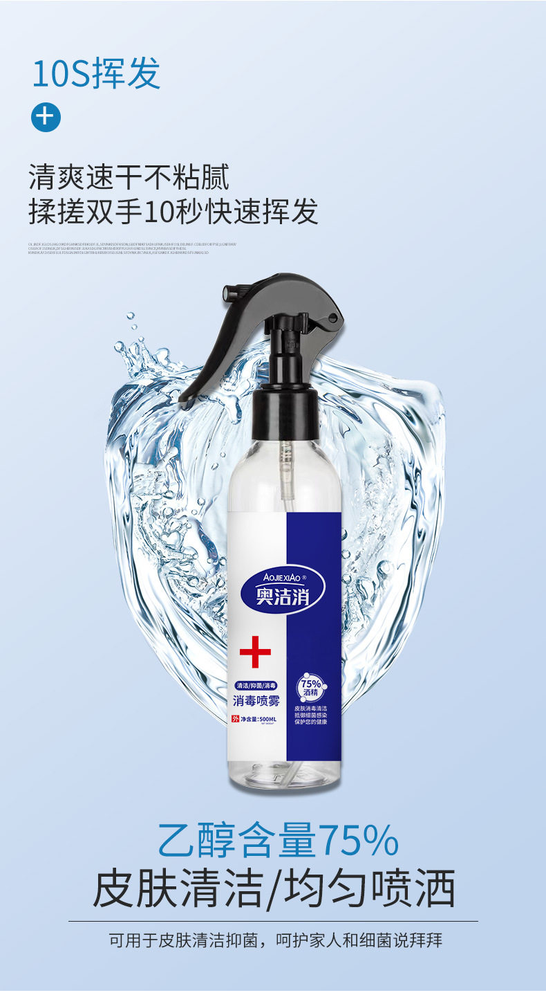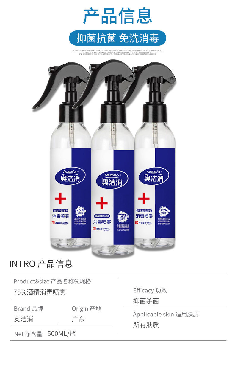 商品名称:奥洁消 75%酒精消毒液 喷雾型 500ml/瓶 单位:瓶