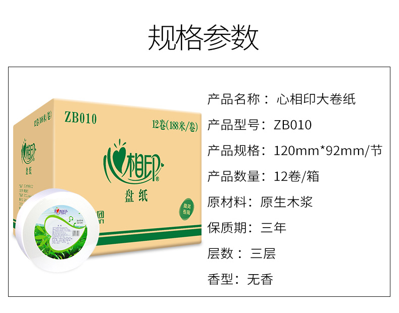 商品名称:心相印ZB010大盘纸无香120*92mm/节 3层 188米/卷 12卷/箱 单位:箱
