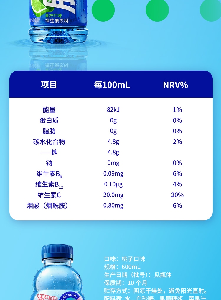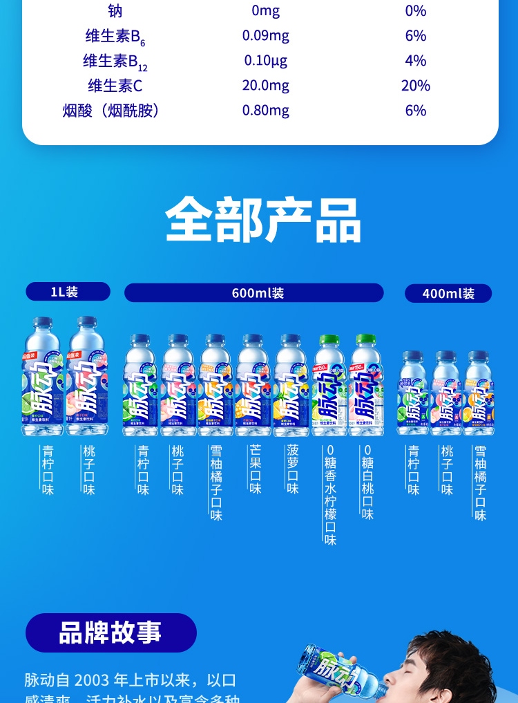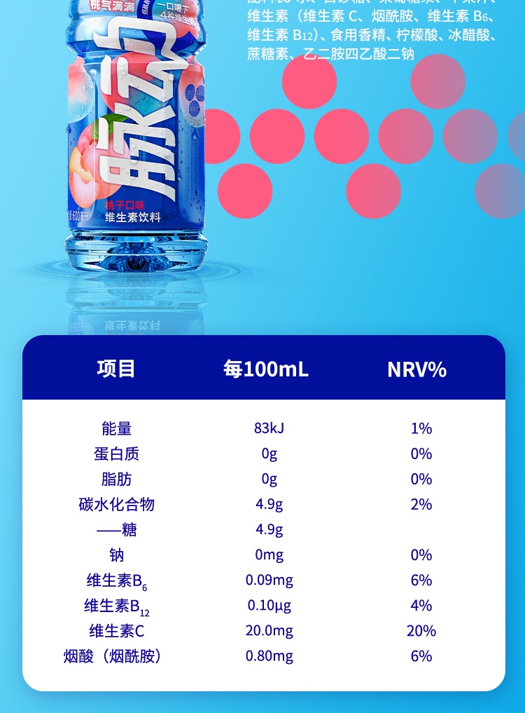 商品名称:脉动维生素饮料 桃子口味 600ml/瓶 单位:瓶