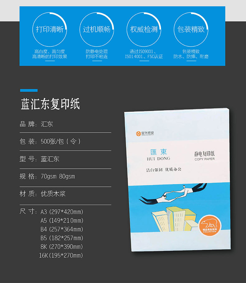商品名称:蓝汇东复印纸 A5 80g 500张/包 10包/箱 单位:包