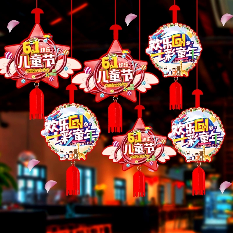 商品名称:六一儿童节装饰品 五星挂饰+七彩童年-红色款【6个装挂钩】单位:组