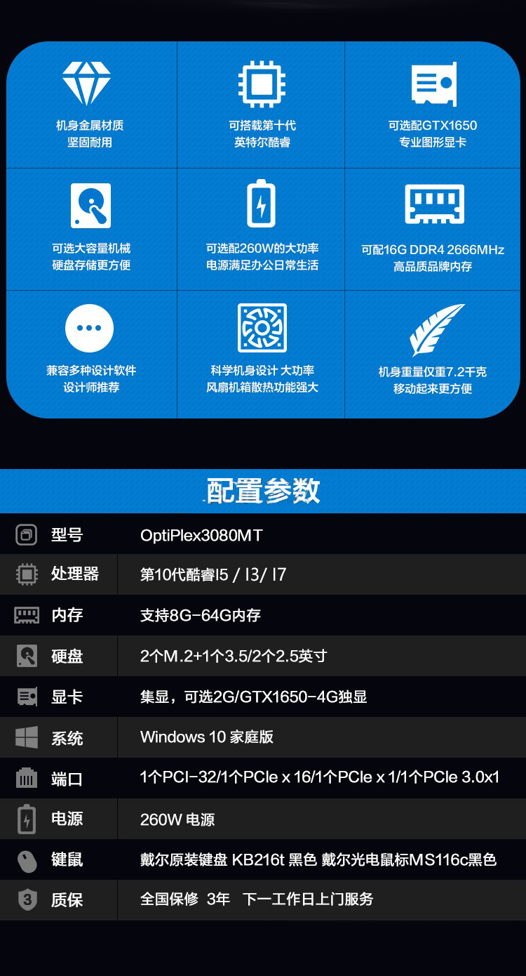 商品名称:戴尔OptiPlex 3080MT台式电脑(I5-10505/8G/256GSSD+1TB/集显/WIN10/23.8寸/3年上门服务)单位:台