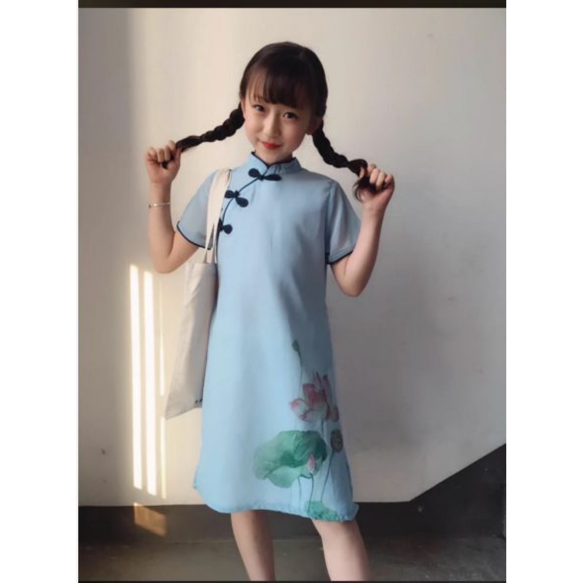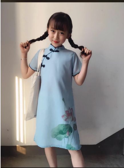 六一儿童节民国演出服 蓝色女旗袍中国风 130cm