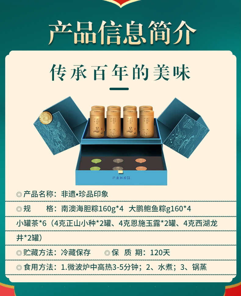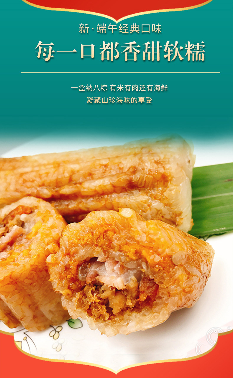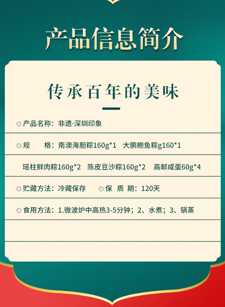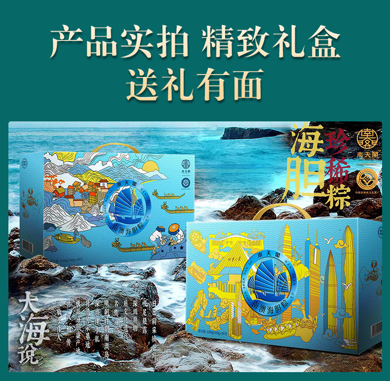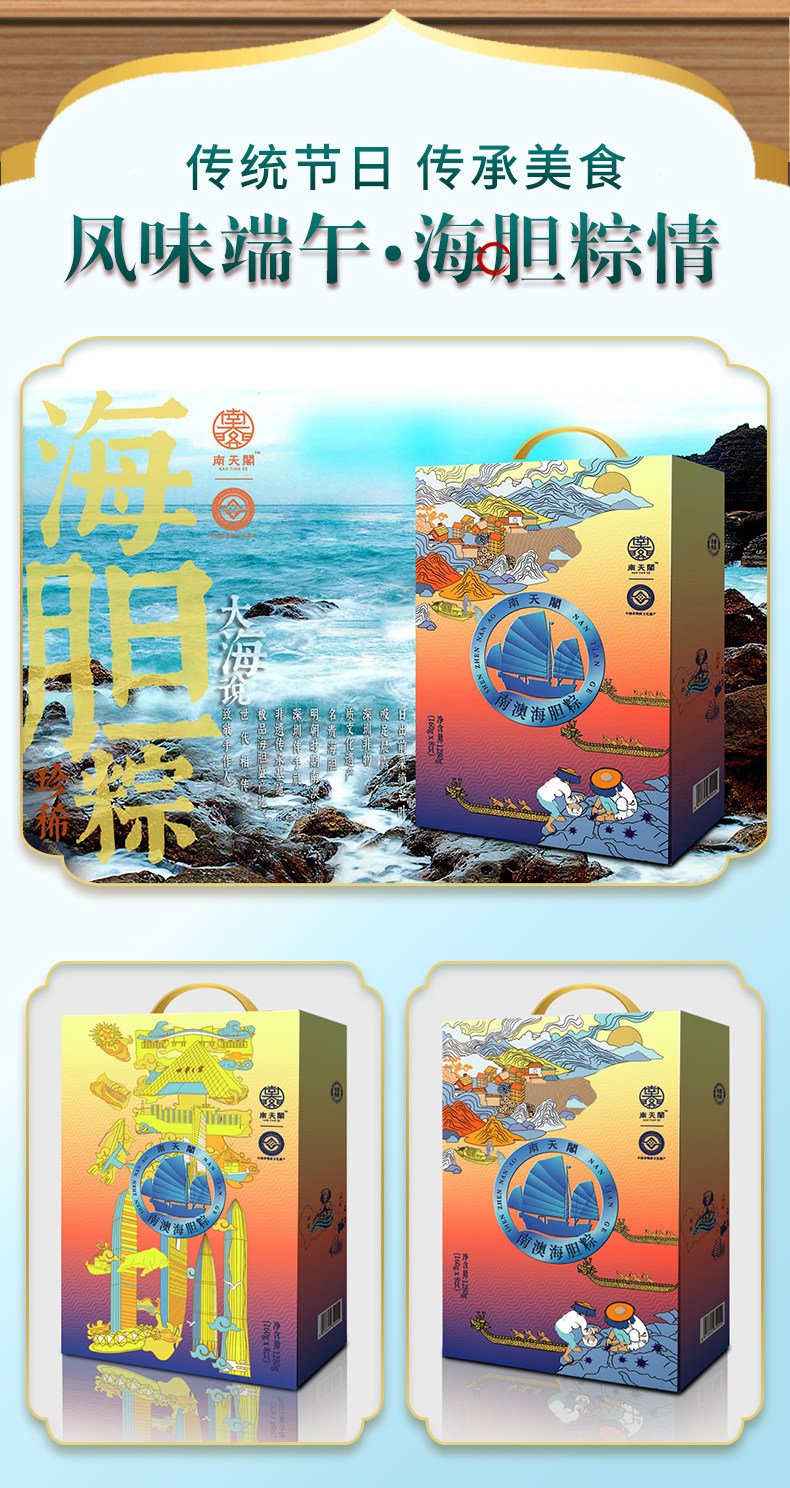 商品名称:南天阁粽子(海胆粽160g*1,鲍鱼粽160g*1,瑶柱鲜肉粽160g*2,陈皮豆沙粽160g*2,高邮咸蛋60g*4) 深圳印象 1200g/盒 单位:盒