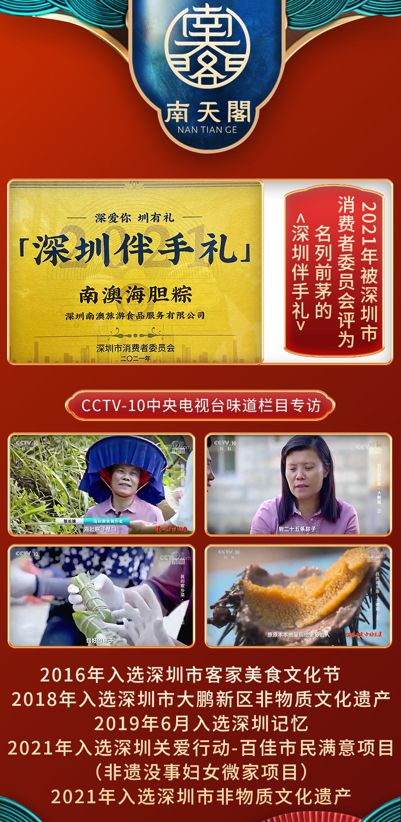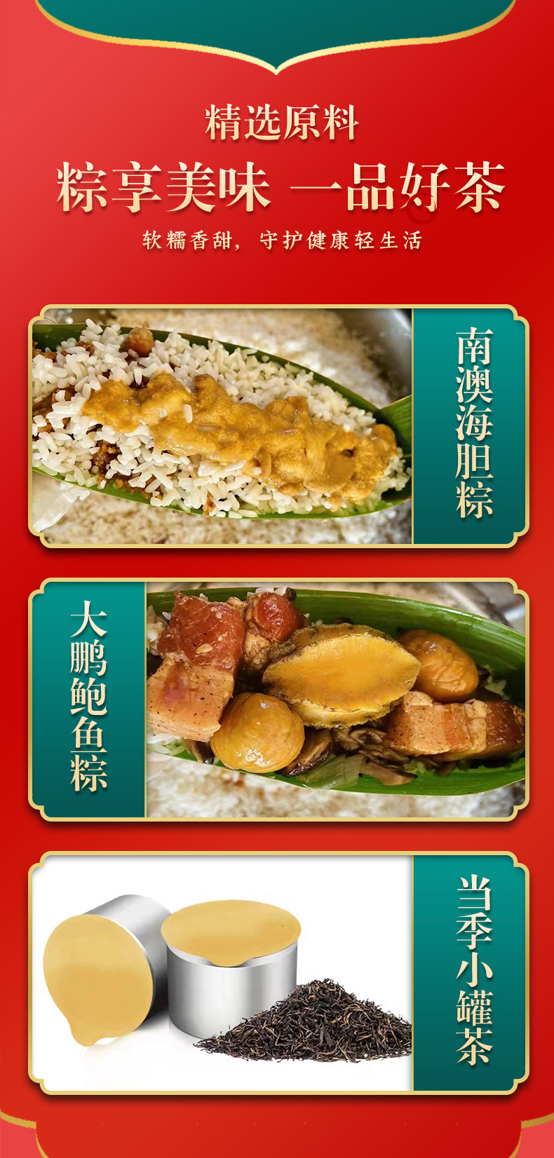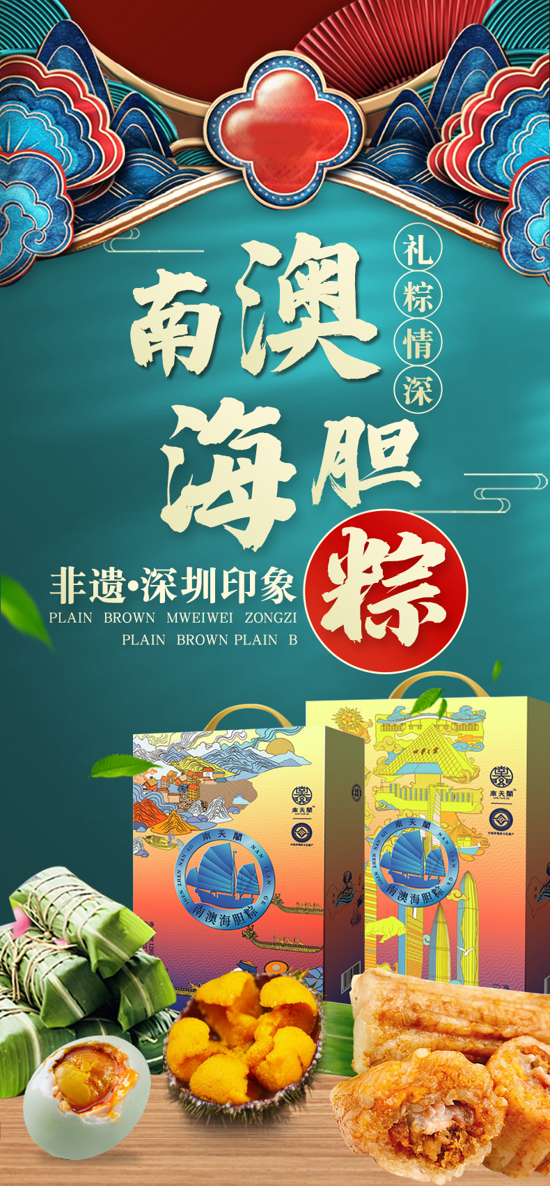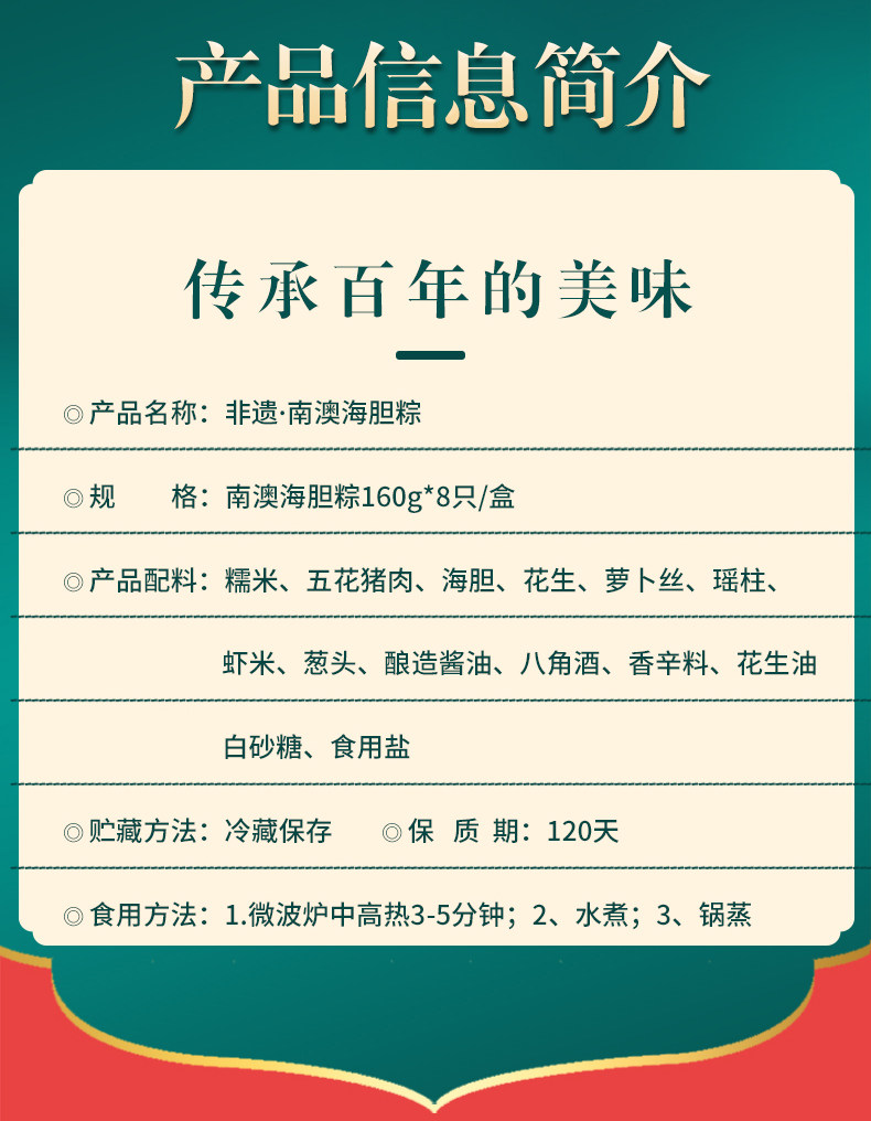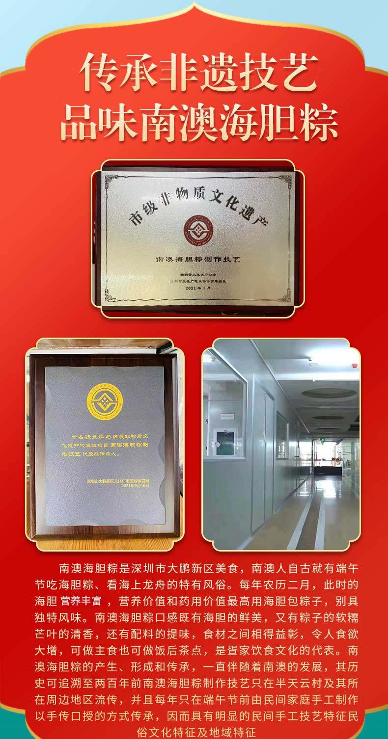 商品名称:南天阁粽子(海胆粽160g*1,鲍鱼粽160g*1,瑶柱鲜肉粽160g*2,陈皮豆沙粽160g*2,高邮咸蛋60g*4) 深圳印象 1200g/盒 单位:盒