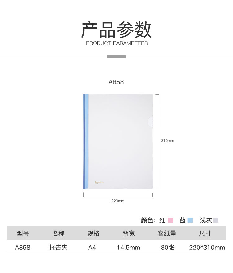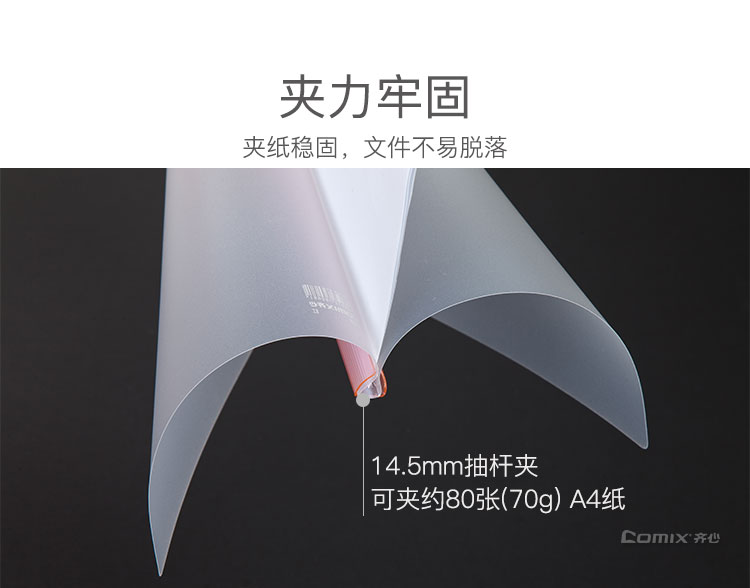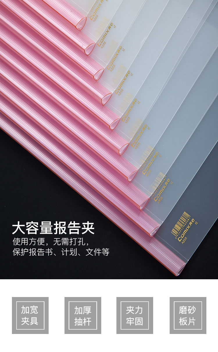 商品名称:齐心A858大容量加厚型报告夹 A4 抽杆式 80张 白色 10个/包 单位:个