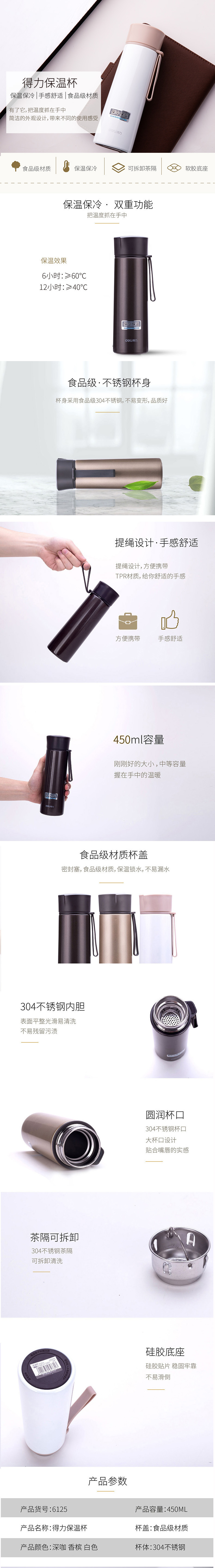 商品名称:得力6125保温杯304不锈钢 香槟色 旋盖 450ml 单位:个