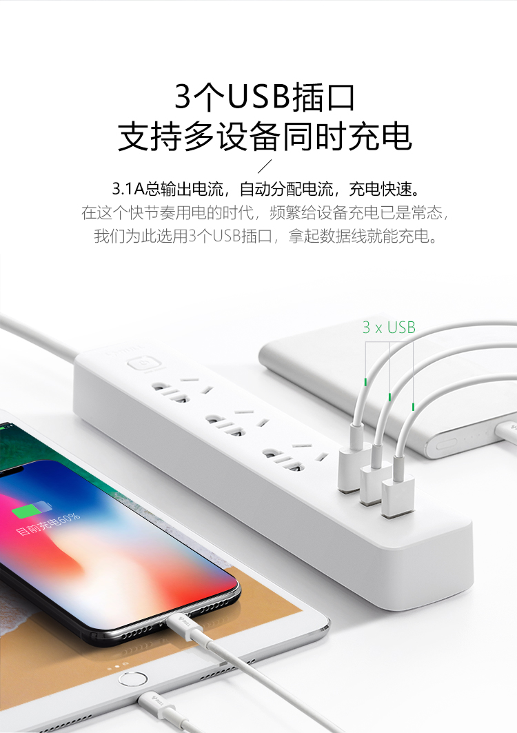 商品名称:公牛GN-B403U新国标小白USB插座排插 3usb接口+3孔全长1.8米 单位:个