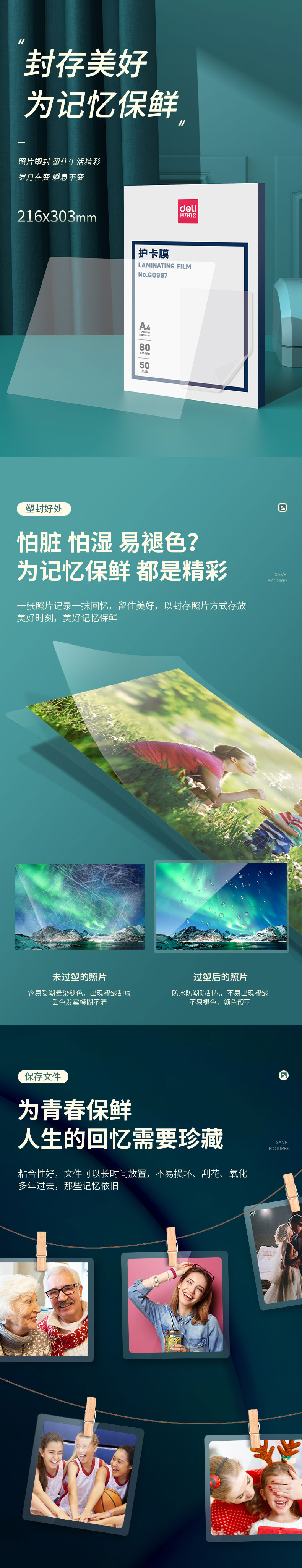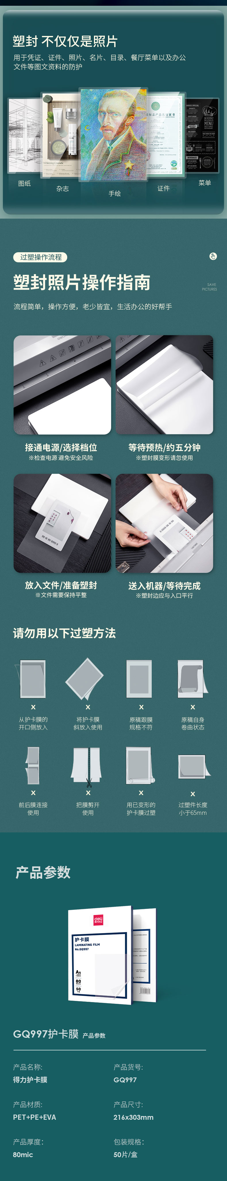 商品名称:得力GQ997护卡膜 透明白 50片/盒 单位:盒