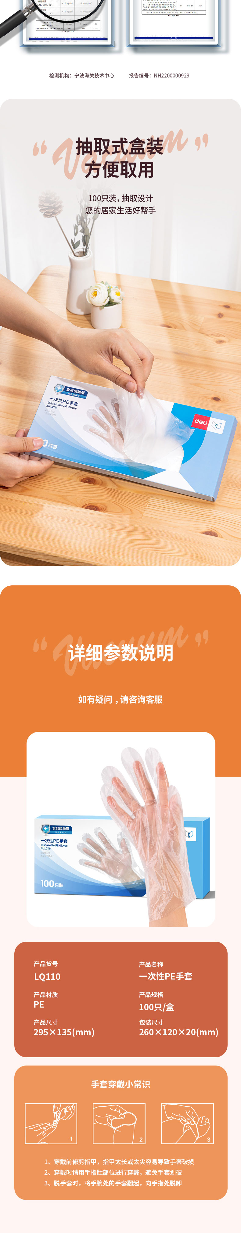 商品名称:得力LQ110一次性PE手套 透明 100只/盒 单位:盒