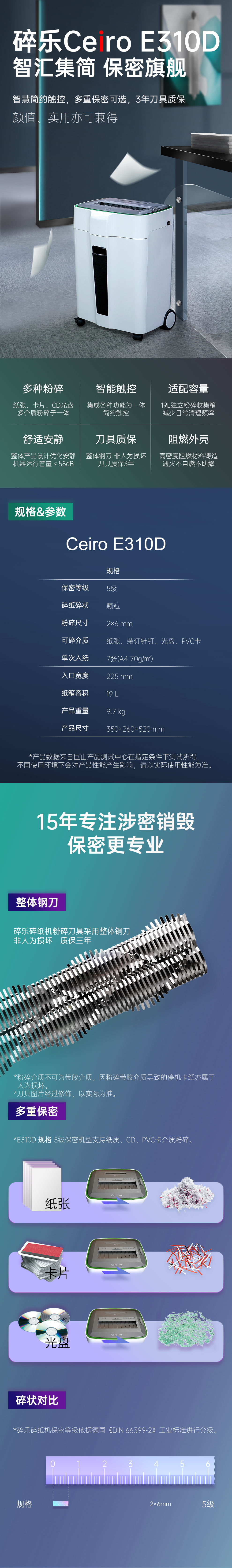 商品名称:碎乐E310D碎纸机 5级保密/可碎纸、PVC卡、光盘/2*6mm/单次碎纸7张/19L 单位:台