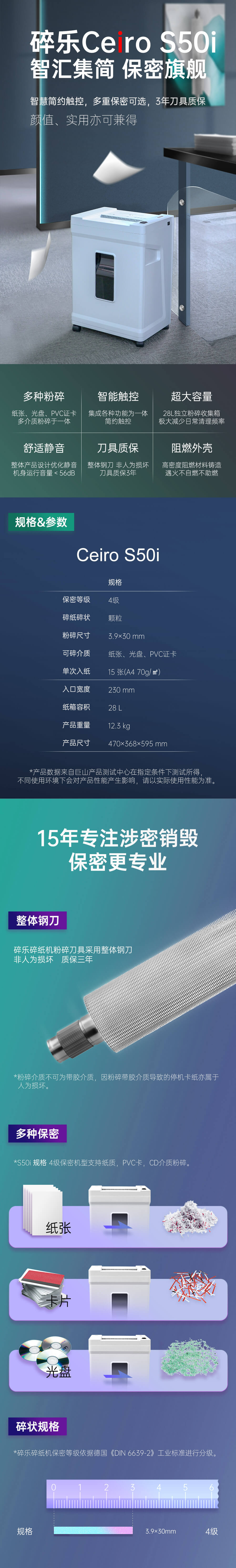 商品名称:碎乐S50i碎纸机 4级保密/可碎纸、PVC卡、光盘/3.9*30mm/单次碎纸15张/28L 单位:台