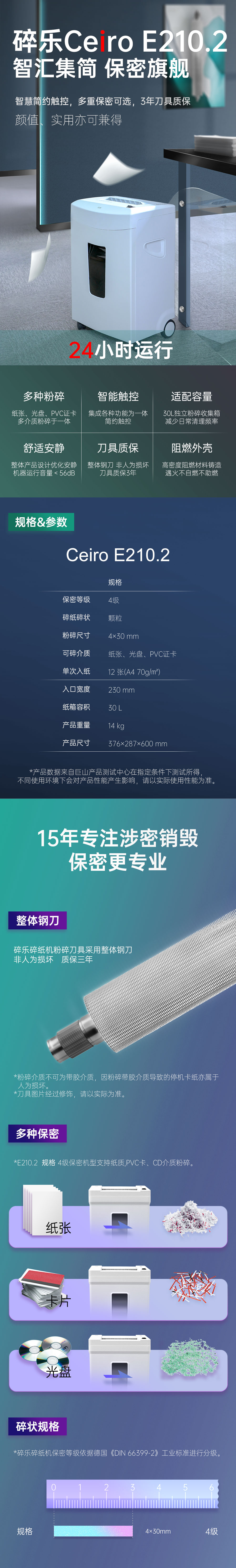 碎乐E210.2碎纸机 4级保密/可碎纸、证卡、光盘/4*30mm/单次碎纸12张/30L 单位:台