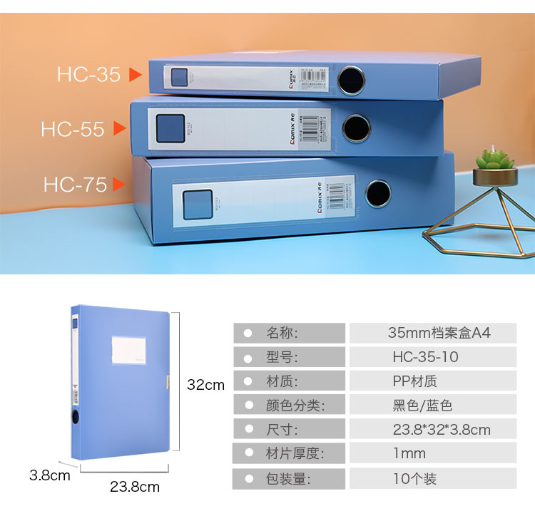齐心HC-75加厚耐用型粘扣档案盒A4 10个装 75mm 蓝色