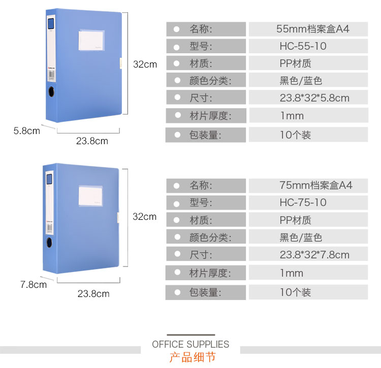 商品名称:齐心HC-75加厚耐用型粘扣档案盒A4 75mm 蓝色12个/箱(单位:个)