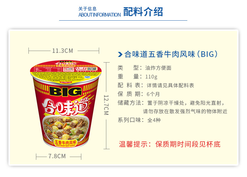 商品名称:合味道方便面 五香牛肉风味 110g/杯 12杯/箱 单位:箱