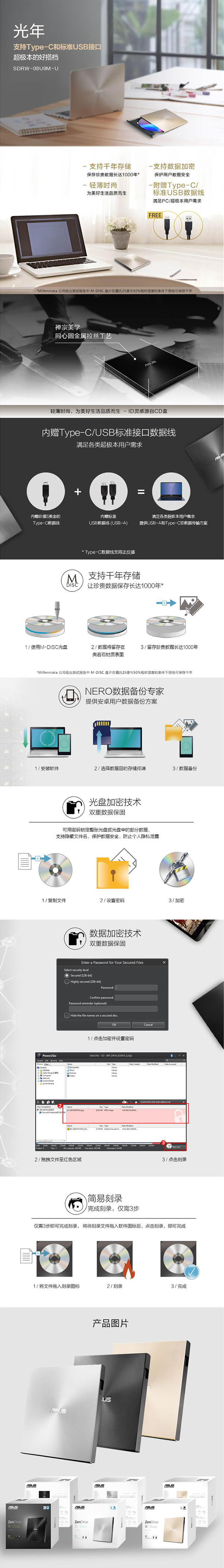 商品名称:华硕SDRW-08U9M-U外置DVD刻录机 8倍速 移动光驱 支持USB/Type-C接口 单位:个