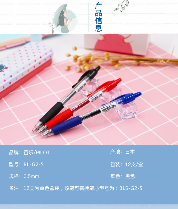 商品名称:百乐BL-G2-5按动中性笔 0.5mm 黑色 12支/盒 单位:盒