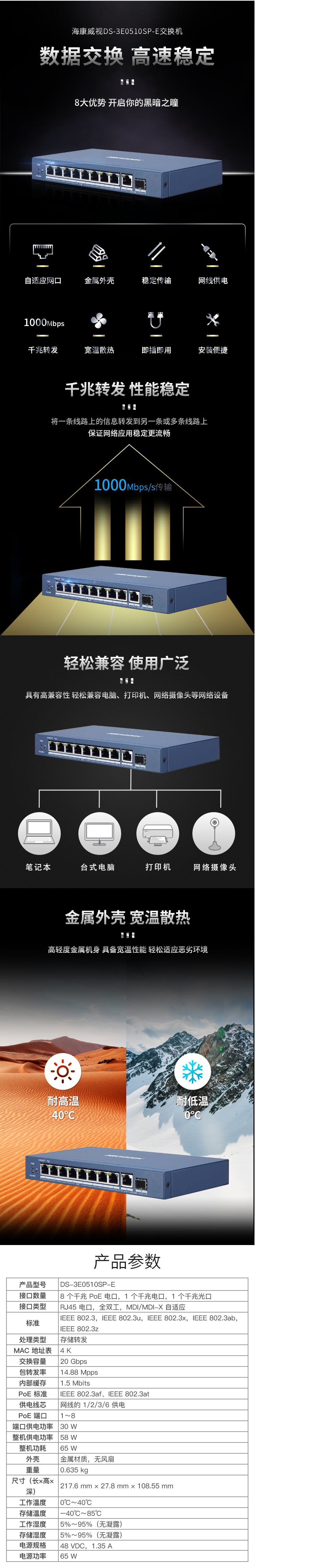 商品名称:海康威视DS-3E0510SP-E 10口千兆交换机 非网管 二层POE网络交换机 单位:台