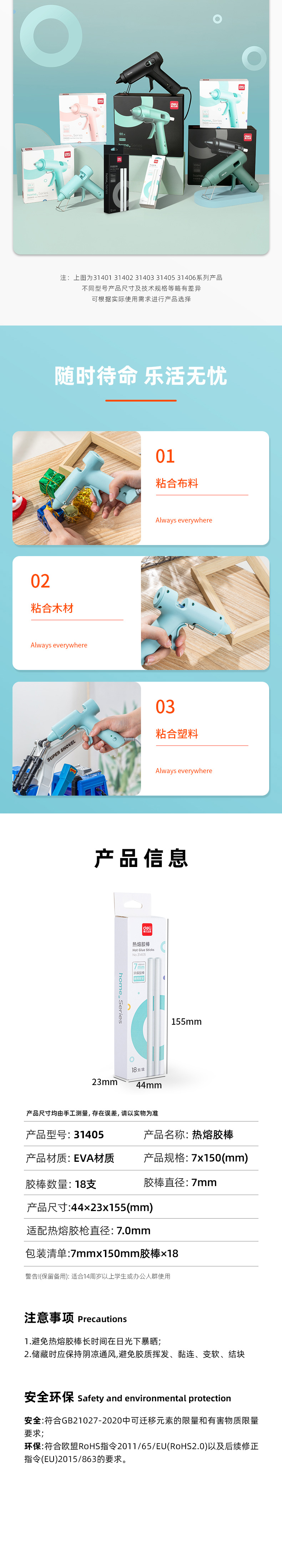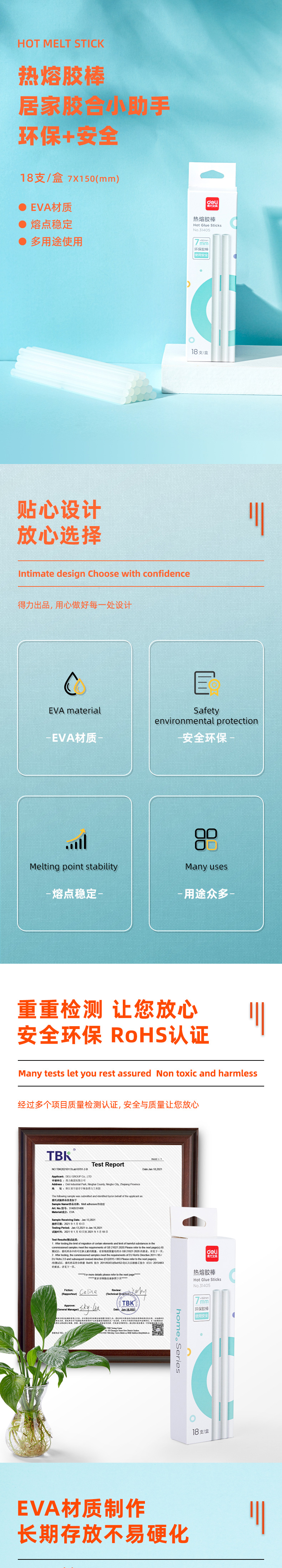 商品名称:得力31405热熔胶棒φ7mm 白色 18支/盒 单位:盒