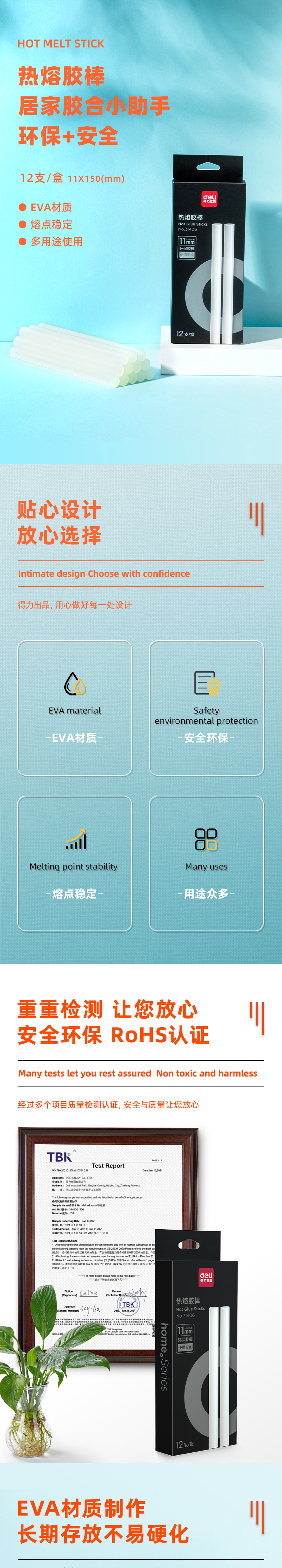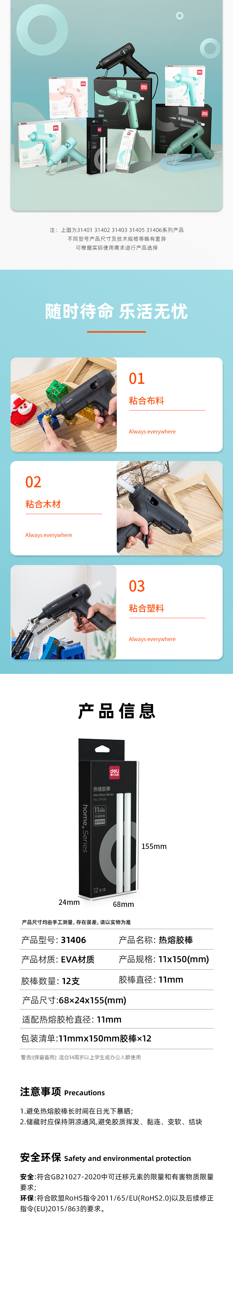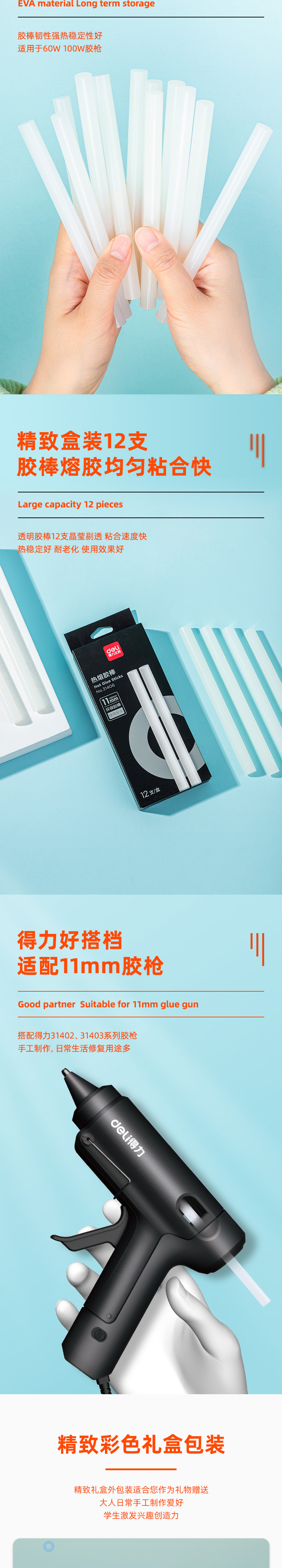 商品名称:得力31406热熔胶棒φ11mm 白色 11*150mm 12支/盒 单位:盒