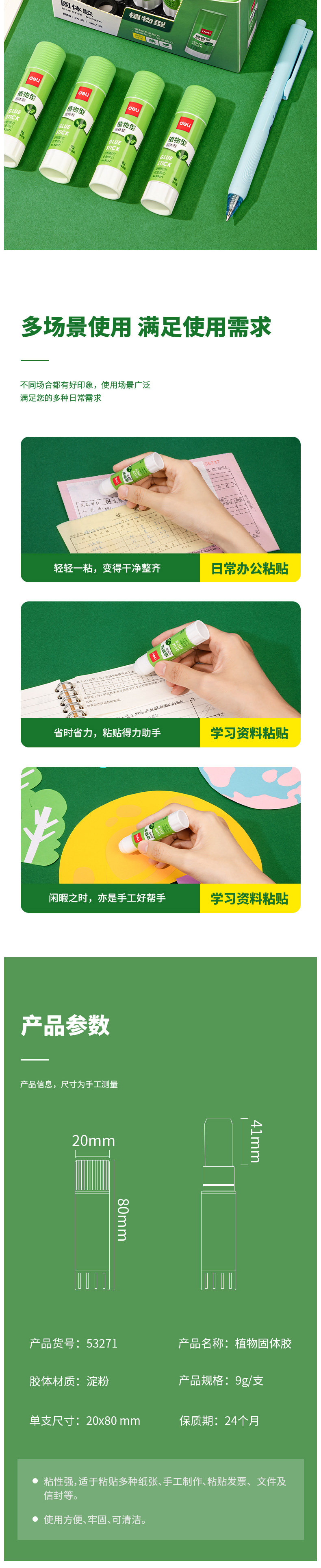 商品名称:得力53271植物固体胶 白色 9g/支 24支/盒 单位:盒