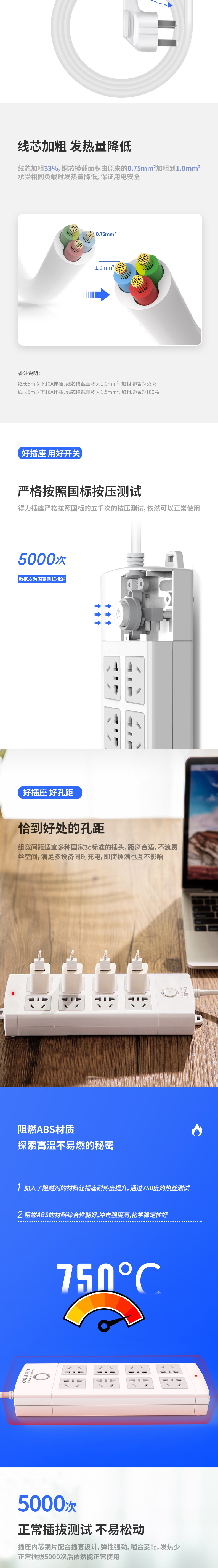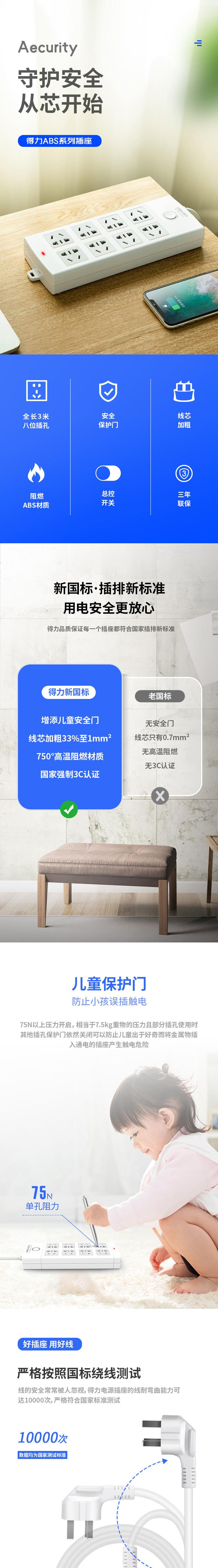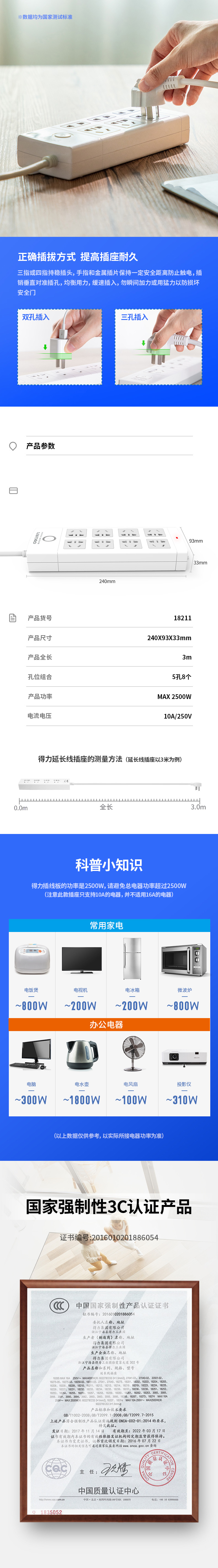 商品名称:得力18211插座 8组 3米 PVC袋装 白色 单位:个