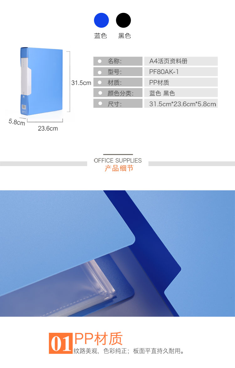 商品名称:齐心 PF80AK-1大容量资料册 80页A4资料册 配外壳 蓝色