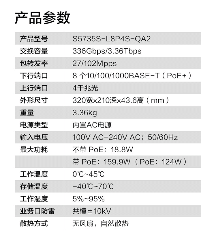 商品名称:华为S5735S-L8P4S-QA2交换机 8个千兆电口+4个千兆光口 单位:台