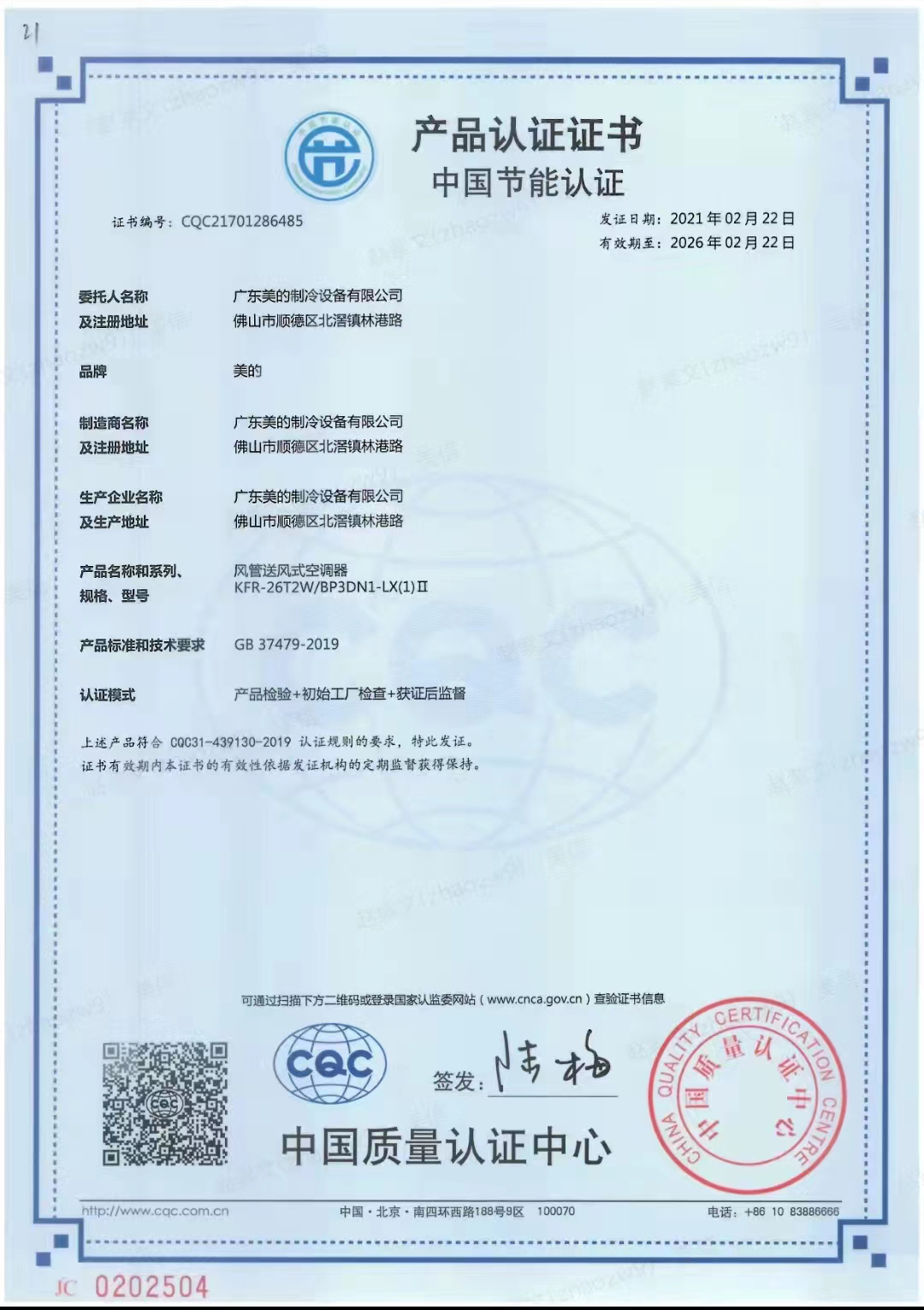 商品名称:美的KFR-26T2W/BP3DN1-LX(1)Ⅱ风管机空调 1匹/一级能效/冷暖 单位:台